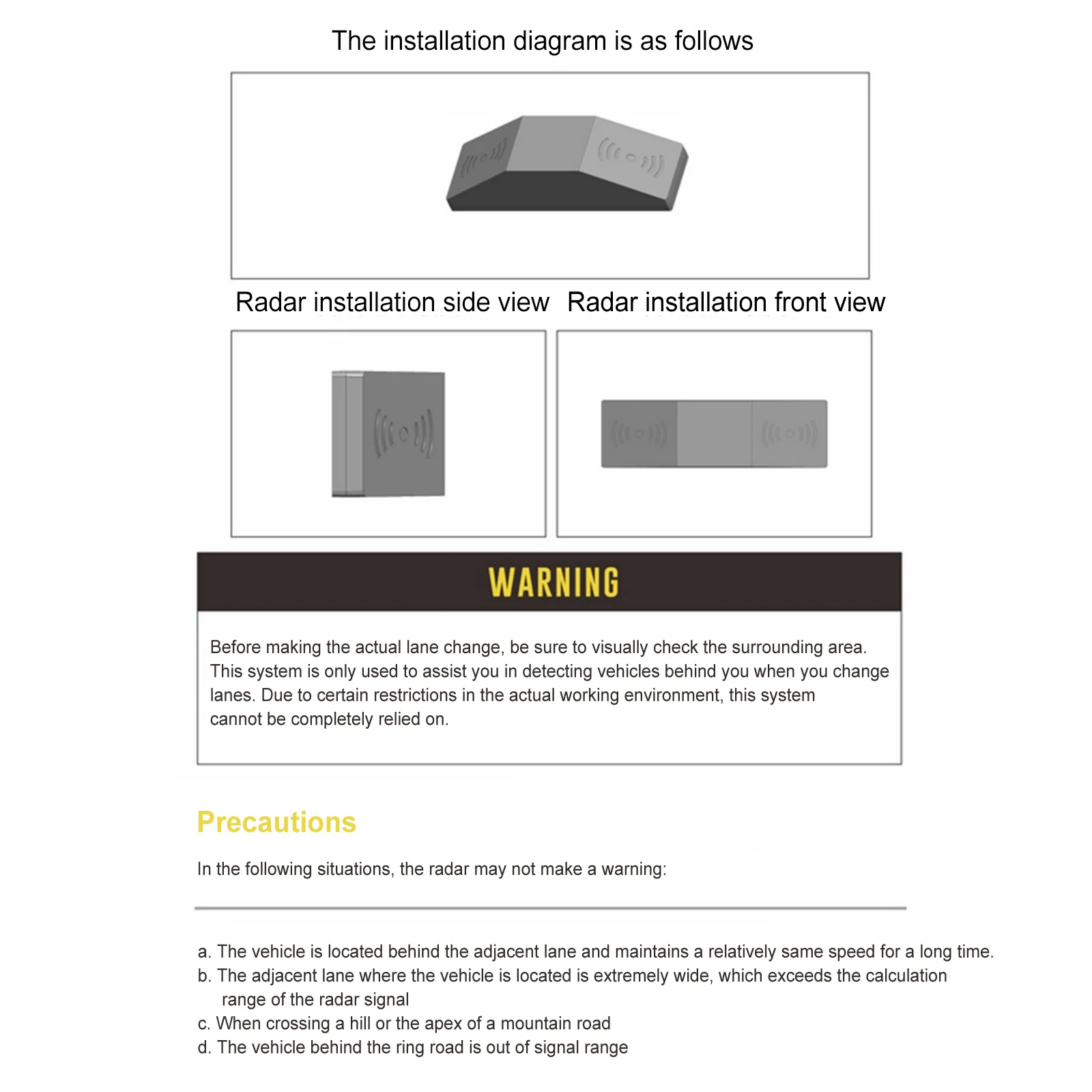 Перед тем, как сделать фактическое изменение полосы движения, убедитесь в том, чтобы визуально проверить окружающую область. Эта система используется только для того, чтобы помочь вам в обнаружении транспортных средств позади вас, когда вы меняете полосы движения. Из-за некоторых ограничений фактической рабочей среды, на эту систему нельзя полностью полагаться.