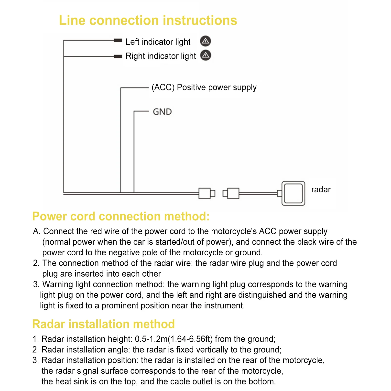 3. Положение установки радара: радар установлен в задней части мотоцикла, поверхность радарного сигнала Соответствует задней части мотоцикла, радиатор находится сверху, И Кабельная розетка находится внизу.
