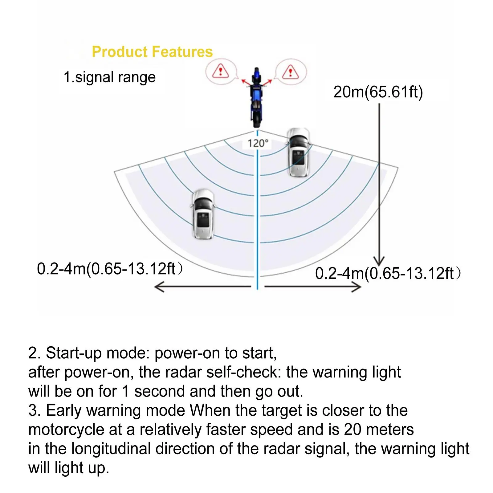 Этот продукт может дать раннее предупреждение опасным мишеням в левой и правой задней части мотоцикла, 24 ГГц микроволновый радар, его уникальные возможности проникновения дыма, туман и пыль могут реализовать любую погоду и все время применения, он способен обнаруживать цель до 20 метров (65,61ft) по максимуму и, наконец, выводить предупреждающие сигналы. Предупреждающие сигналы включают светильник всегда и светильник мигает.