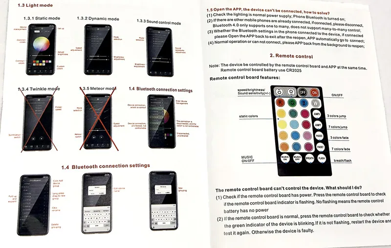 Светильник: цвет Stati (смешанный белый, чистый белый, красный, зеленый, синий, желтый, голубой, розовый + DIY цвет), прыжок, выцветание, четырехскоростное мерцание, контроль яркости, скорость режима,