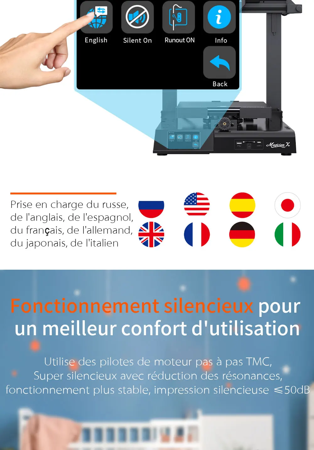 L'imprimante 3D Magician X dispose également de nombreuses fonctions utiles. La reprise de l'impression permet d'économiser du filament et du temps. Lorsque le filament est épuisé ou cassé, le détecteur de filament déclenche automatiquement une alarme et arrête l'impression, qui est trés sympatique à utusser.