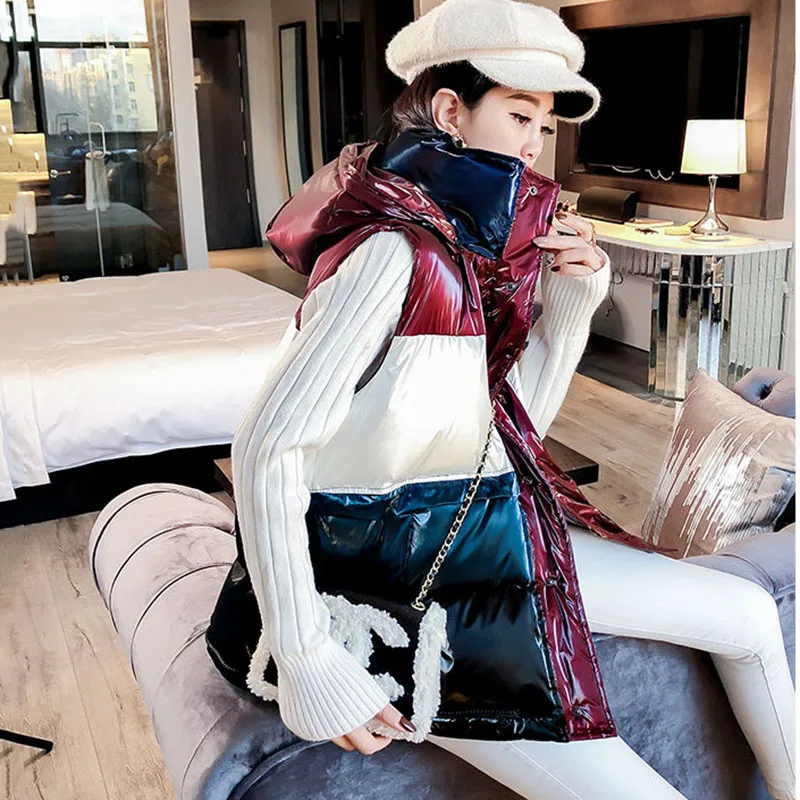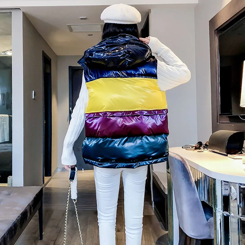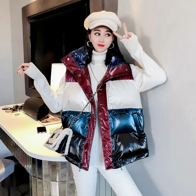 Женский модный Блестящий жилет на пуху, Женская осенне-зимняя куртка без рукавов, с карманами, на молнии, с воротником-стойкой, жилет с капюшоном, топ, Свободный жилет, верхняя одежда