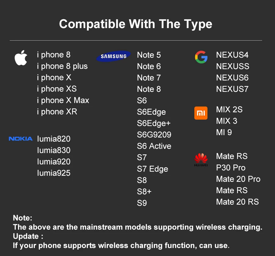 1. Устройства со встроенным беспроводным приемником быстрой зарядки/обычной зарядки (для Samsung Note 8 , iPHONE 8 и т. д.)