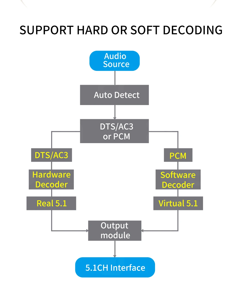 12:Surpport аппаратное декодирование (5,1 Разделение каналов), а также программное декодирование (2,0 что 5.1ch)