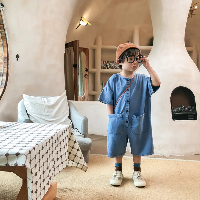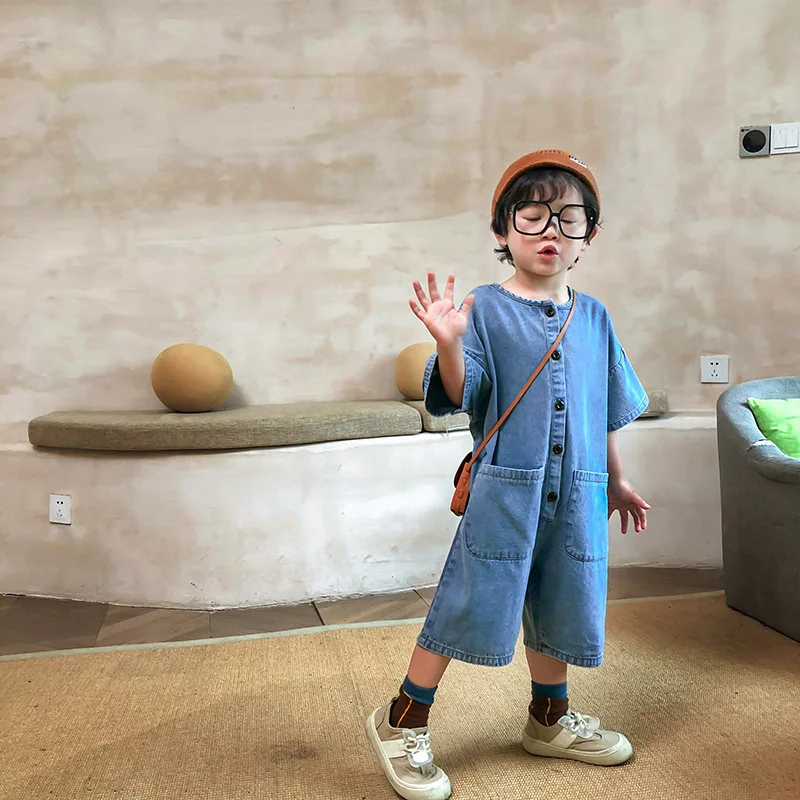 2022 Летний джинсовый комбинезон для маленьких мальчиков и девочек детская одежда комбинезон с короткими рукавами для малышей, детский джинсовый комбинезон милая модная одежда в Корейском стиле для детей 1-6 лет