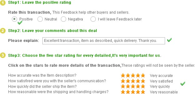 Мы оставим положительную обратную связь для вас после получения оплаты. Ваши отзывы очень важны для нас, положительные отзывы и 5 баллов DSR высоко ценятся.