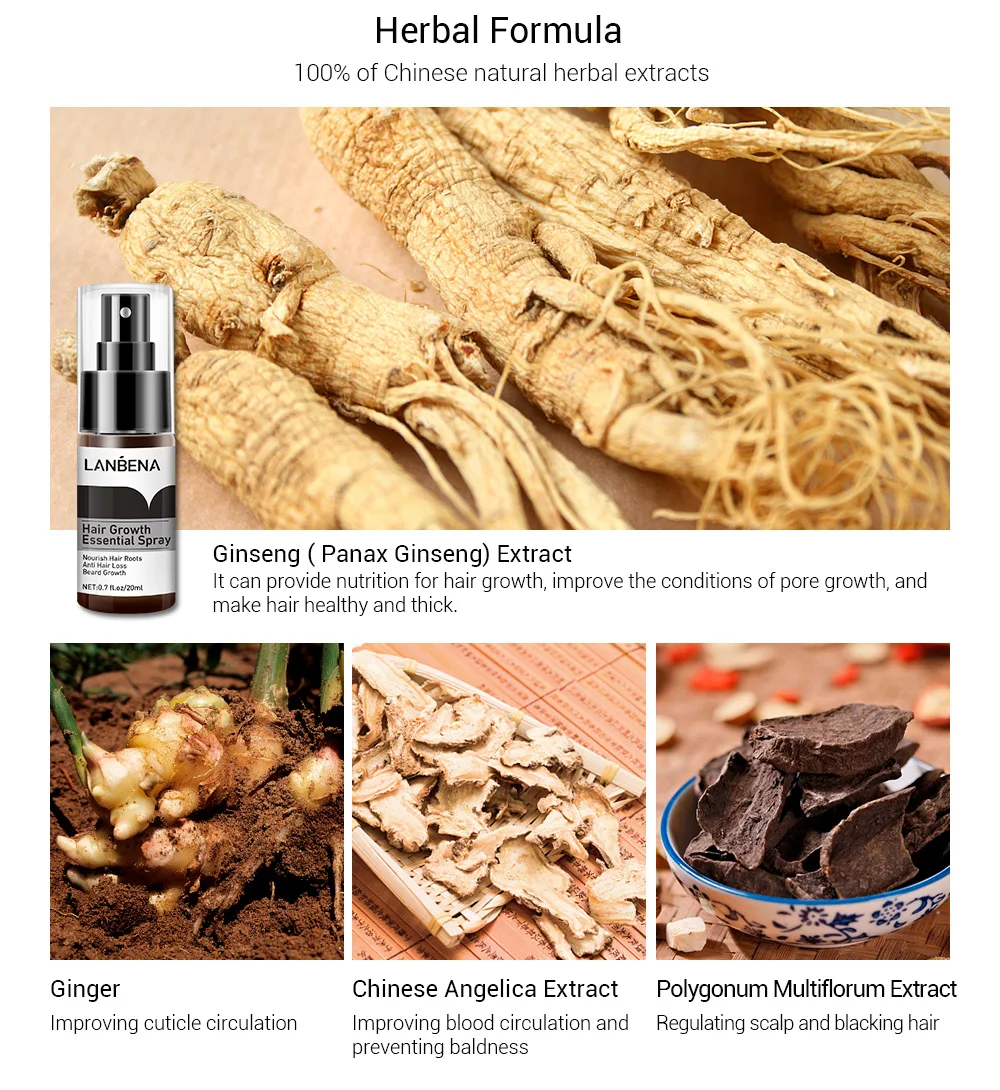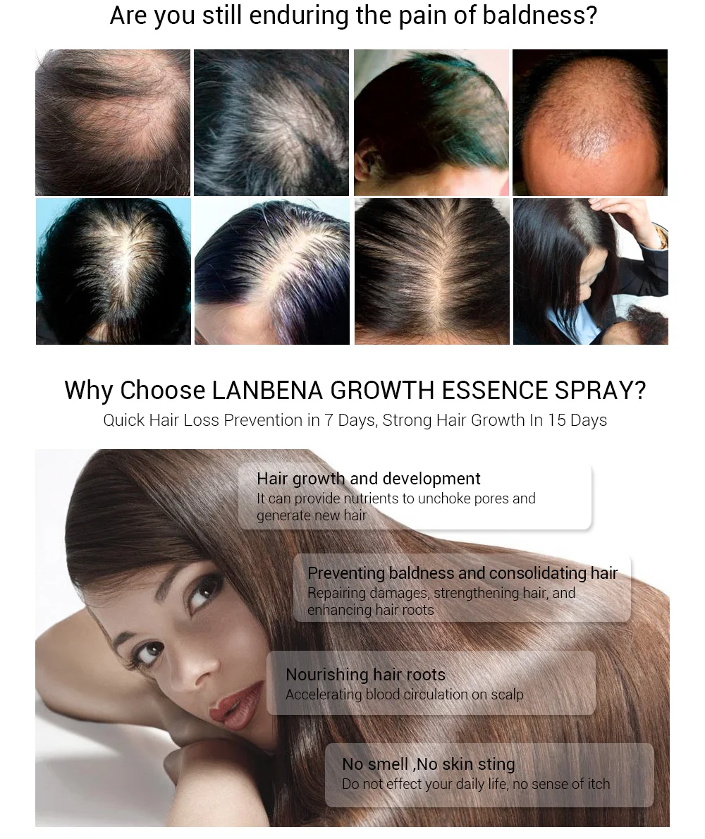 Спрей-эссенция для роста LANBENAИмеет функции ускорения кровообращения на коже головы, улучшения массажа волосяных фолликулов и корней, отек корней волос, содействия синтезу меланина, улучшения качества волос, спрей для роста ланбены (сильная версия) также может помочь вам следующими способами, такими как увеличение эластичности волос, Ускоряет рост волос и тщательно очищает кожное сало пор. Спрей LANBENA ESSENCE для роста эффективен для всех видов выпадения волос, алопеции и алопеции totalis. Это самый эффективный травяной продукт для роста волос.