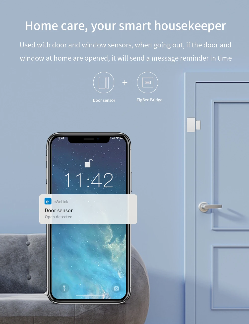Датчик двери/окна SONOFF ZigBee можно поставить на дверь или окно, чтобы сообщить вам с оповещением, если ваша дверь или окно открыты или закрыты, добавив дополнительный слой безопасности для вашего дома.