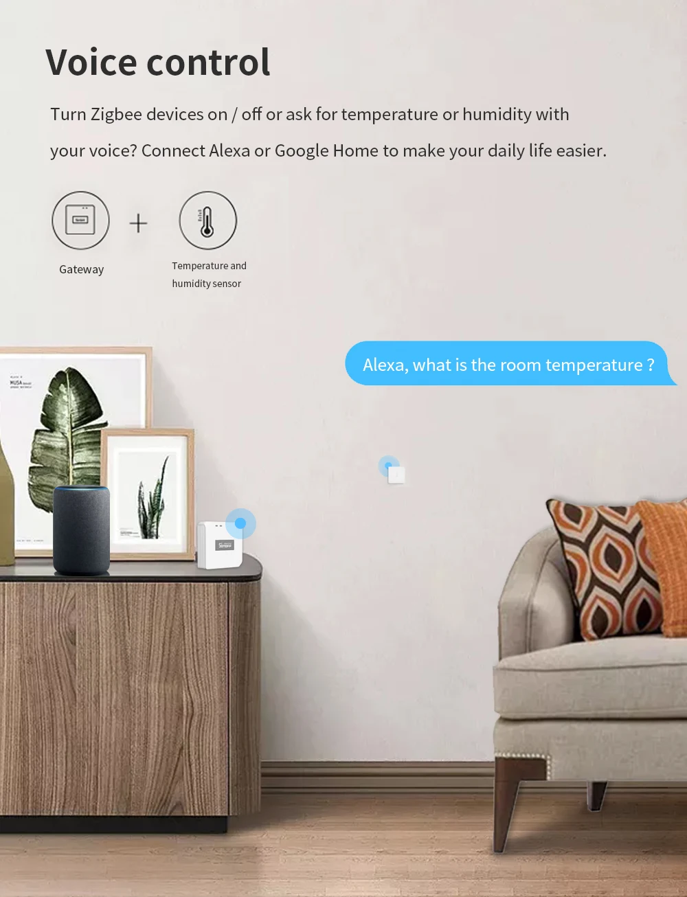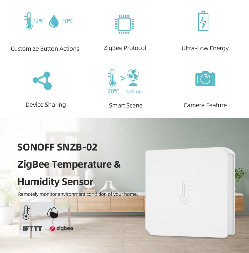 Датчик температуры и влажности SONOFF ZigBee, который может легко работать с мостом SONOFF ZigBee для отслеживания и записи изменения температуры и влажности в вашем доме, которые все показания в реальном времени можно проверить в приложении eWeLink.