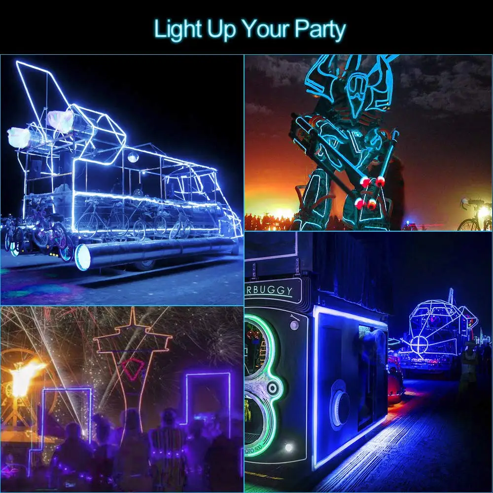 ·[Контроллер батареи 4 режима] светящийся провод непрерывный Вкл/Стробоскоп/мигание и ВЫКЛ, может предложить 360 градусов освещения, нажав кнопку на батарейном блоке.