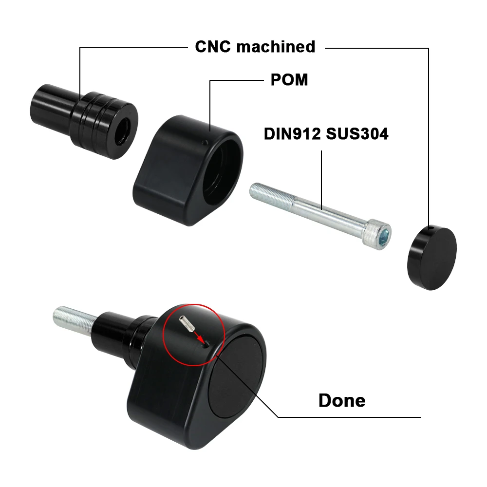 CNC рамка Ползунки Краш колодки протектор Функция: Они предназначены для значительного уменьшения повреждения ваших обтекателей, гильз двигателя и подрамник в случае, если ваш велосипед заканчивается на его стороне. Оснащен съемным пластиковым концом POM, который может быть заменен, если они сильно повреждены. (Пожалуйста, свяжитесь с нами, если вы хотите купить дополнительную пару торцевых колодок) Особенности: Состояние на 100% абсолютно новый Материал: Держатель изготовлен из алюминия с ЧПУ 6063-T6 и анодирован в различные цвета. Торцевая накладка изготовлена из пластика POM, который обладает хорошей устойчивостью от ударов и ношения. Цвета: черный, синий, красный Посылка включает: 1 пара слайдера Инструкции по установке не включены Приспособление: Для BMW F800R 2009-2018