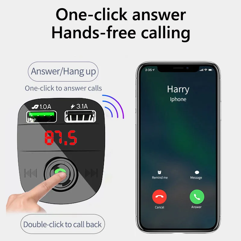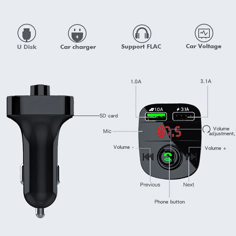 Основная функция: передача звука на ваш автомобильный fm-радио через те же fm-полосы, затем вы можете услышать это аудио в автомобильном динамике.