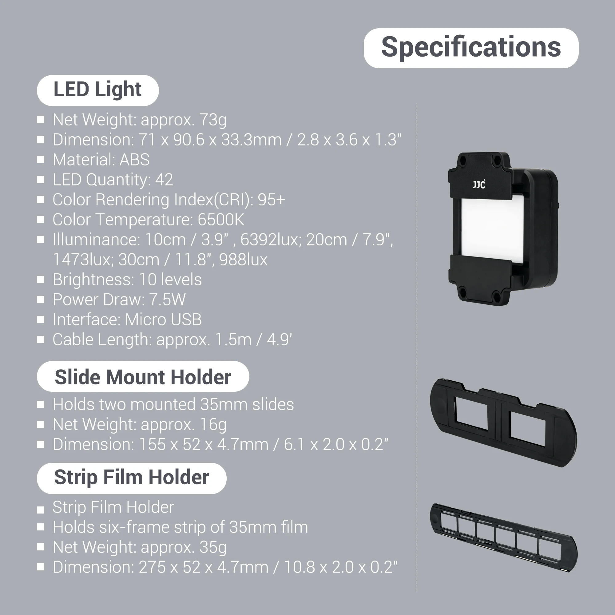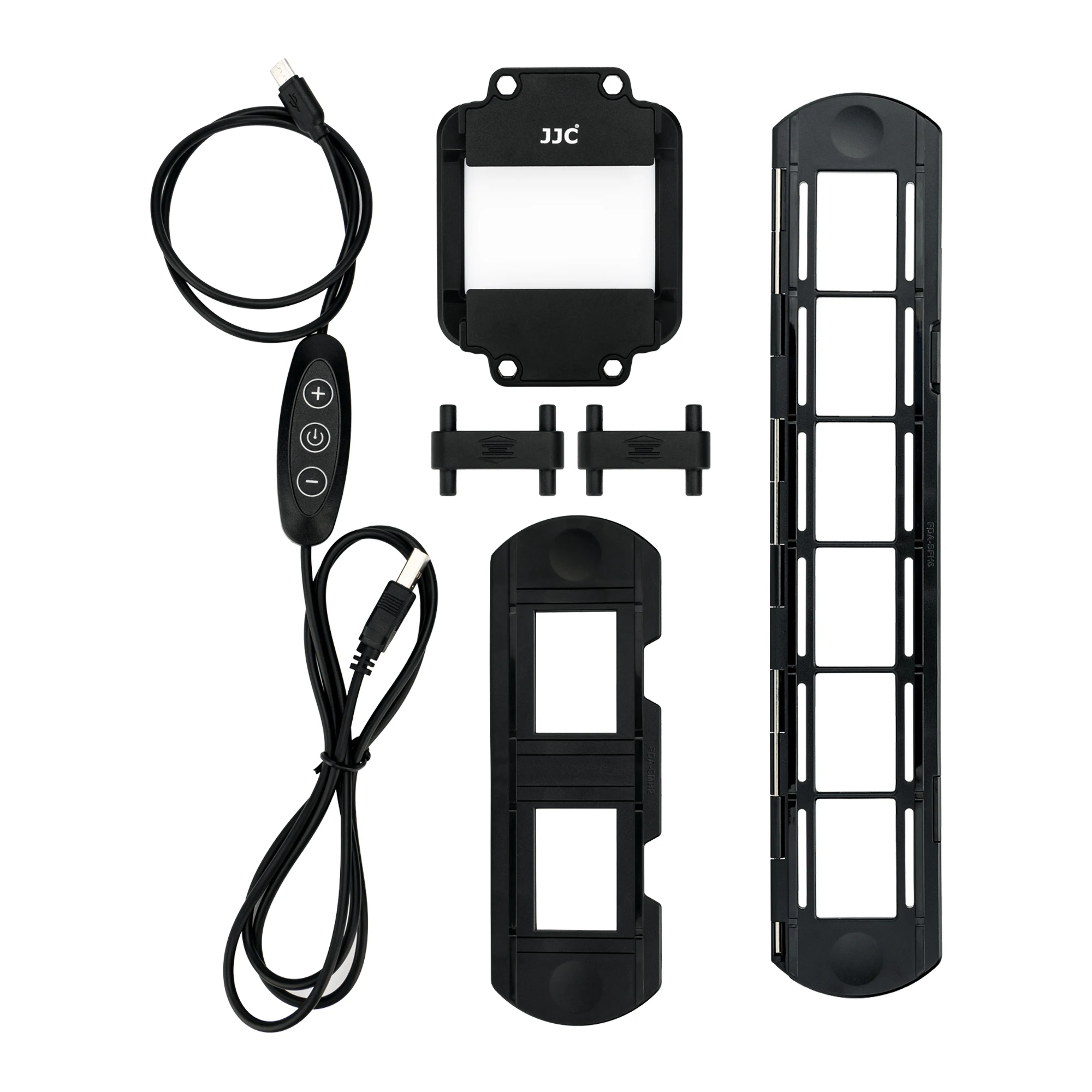 JJC Управление по санитарному надзору за качеством пищевых продуктов и медикаментов-светодиодный 1 светодиодный светильник комплект включает в себя светодиодный светильник, слайд-держатель и полоской пленки, которые специально разработан для отрицательного копирование и преобразует пленка в цифровые файлы. Комплект совместим с микрообъективами и может использоваться для фотосъемки пленки 35 мм.
