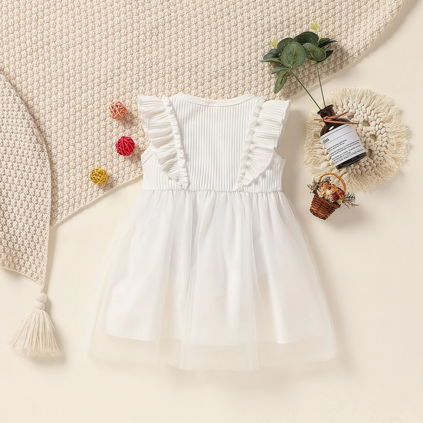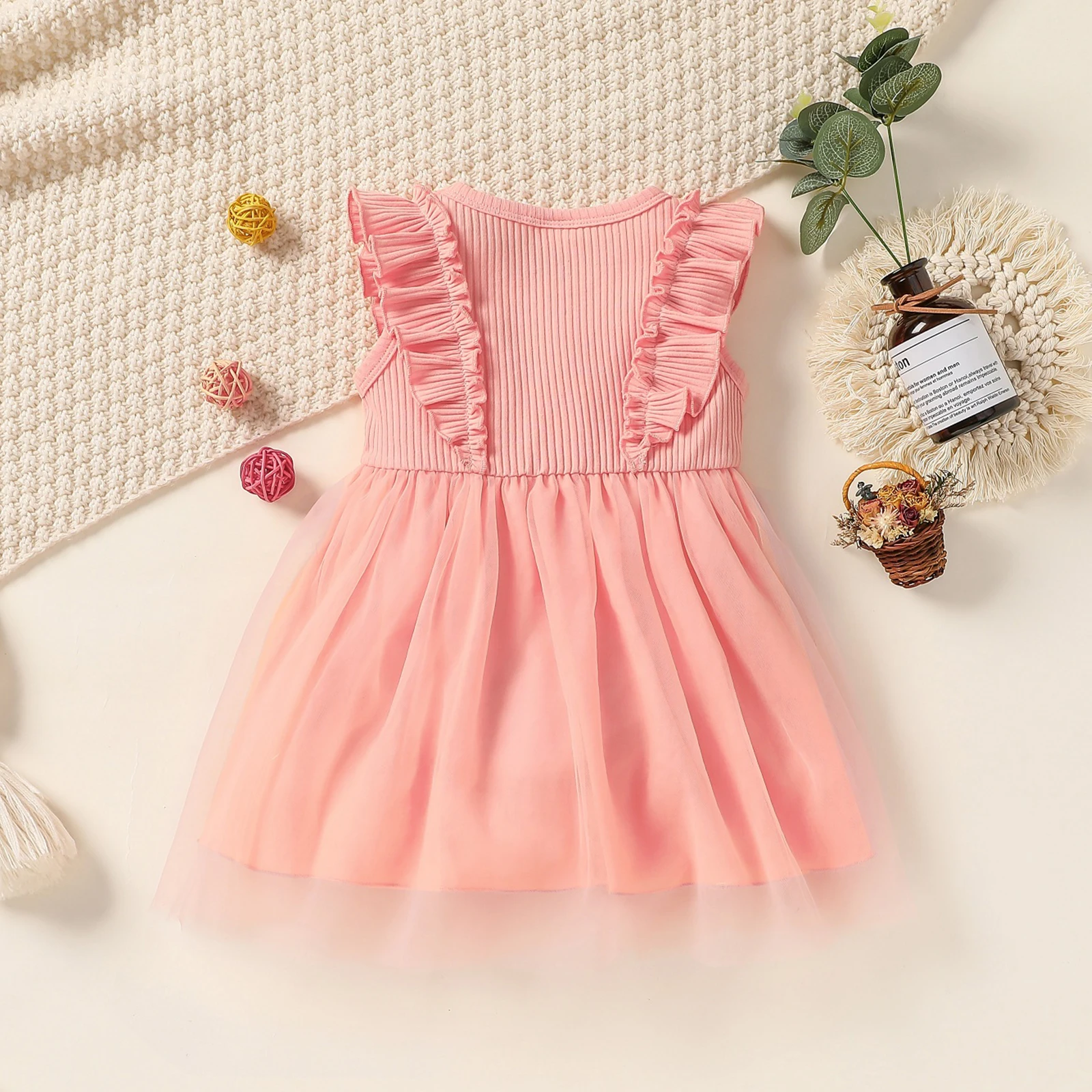Детское Сетчатое платье принцессы для маленьких девочек; Однотонное платье-пачка трапециевидной формы в рубчик с оборками без рукавовОсобенности
