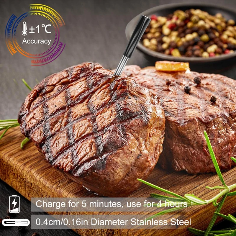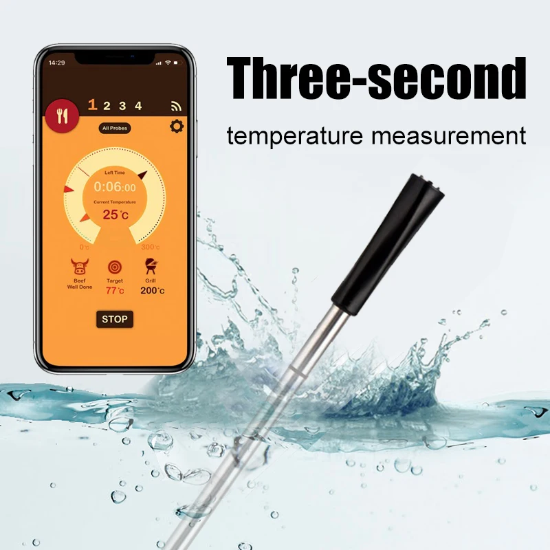 Используя уникальную микроэлектронику и технологию точного производства, данные измерения температуры зонда из нержавеющей стали передаются по беспроводной сети на смартфон, избавившись от толстого и длинного высокотемпературного соединительного провода традиционного термометра для барбекю, что очень удобно для пользователей. Вы можете в любое время следить за родословной и готовностью пищи на мобильный телефон, и когда приготовленная на барбекю еда достигнет заданного значения температуры, она автоматически начнет оповещать. Особенно подходит для закрытых электрических печей и грилей, они заменят традиционные Термометры для барбекю.