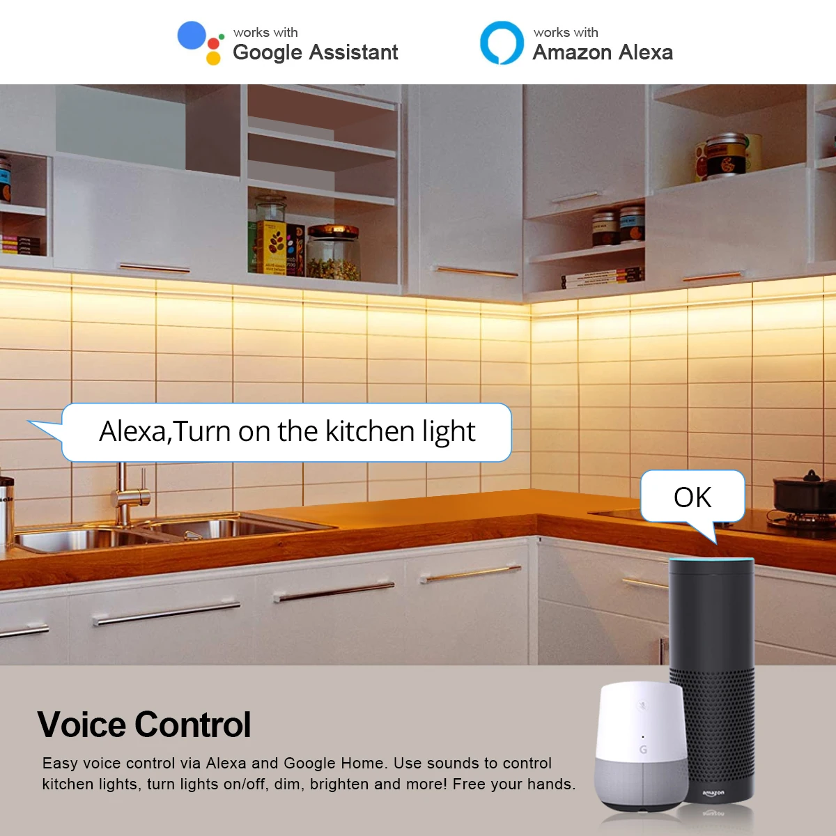 【Голосовое управление 】 Управляйте вашей умной светодиодной лентой через ваш голос с помощью Google Assistant. Просто дайте голосовую команду, чтобы включить/выключить или затемнить/осветить светильник, даже переключите светильник на определенный цвет, как вам нужно. Концентратор не требуется и прост в установке. Нет необходимости подписки.