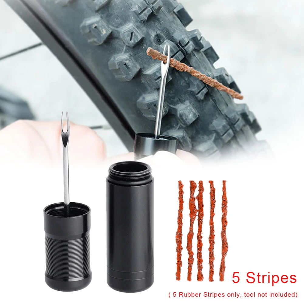 Этот инструмент подходит только для велосипедных бескамерных шин. Для того, чтобы выполнить ремонт проколов, он может быть вставлен 2 полоски одновременно. Если размера двух резиновых полосок недостаточно, чтобы блокировать отверстие, пожалуйста, используйте другой метод.