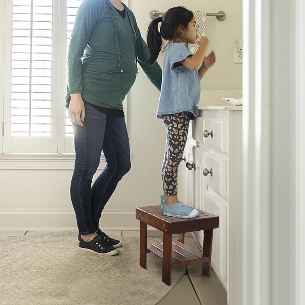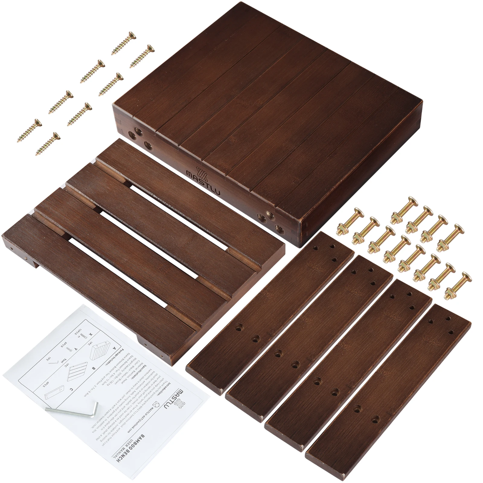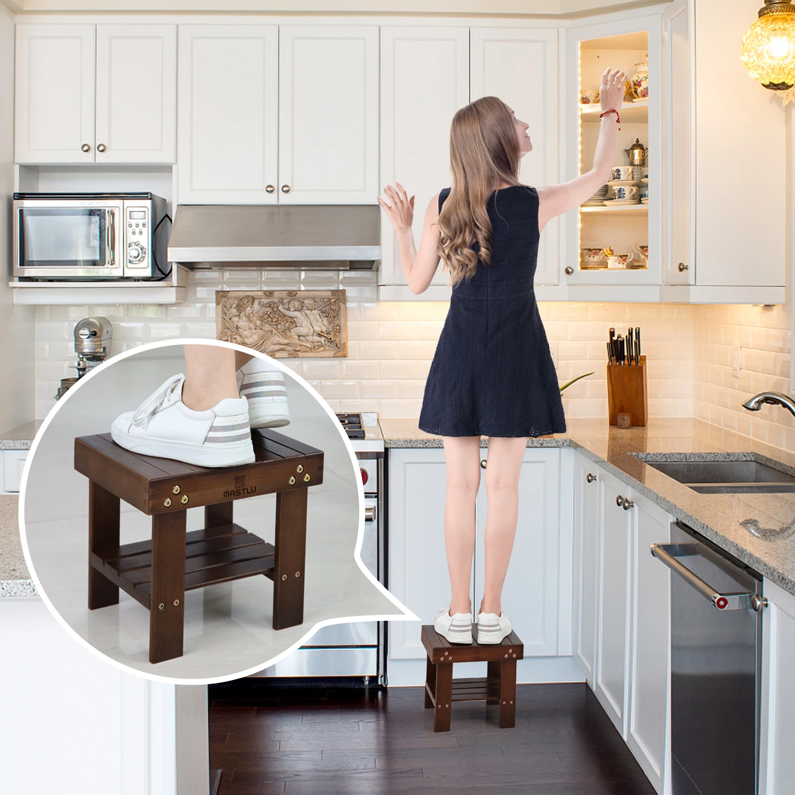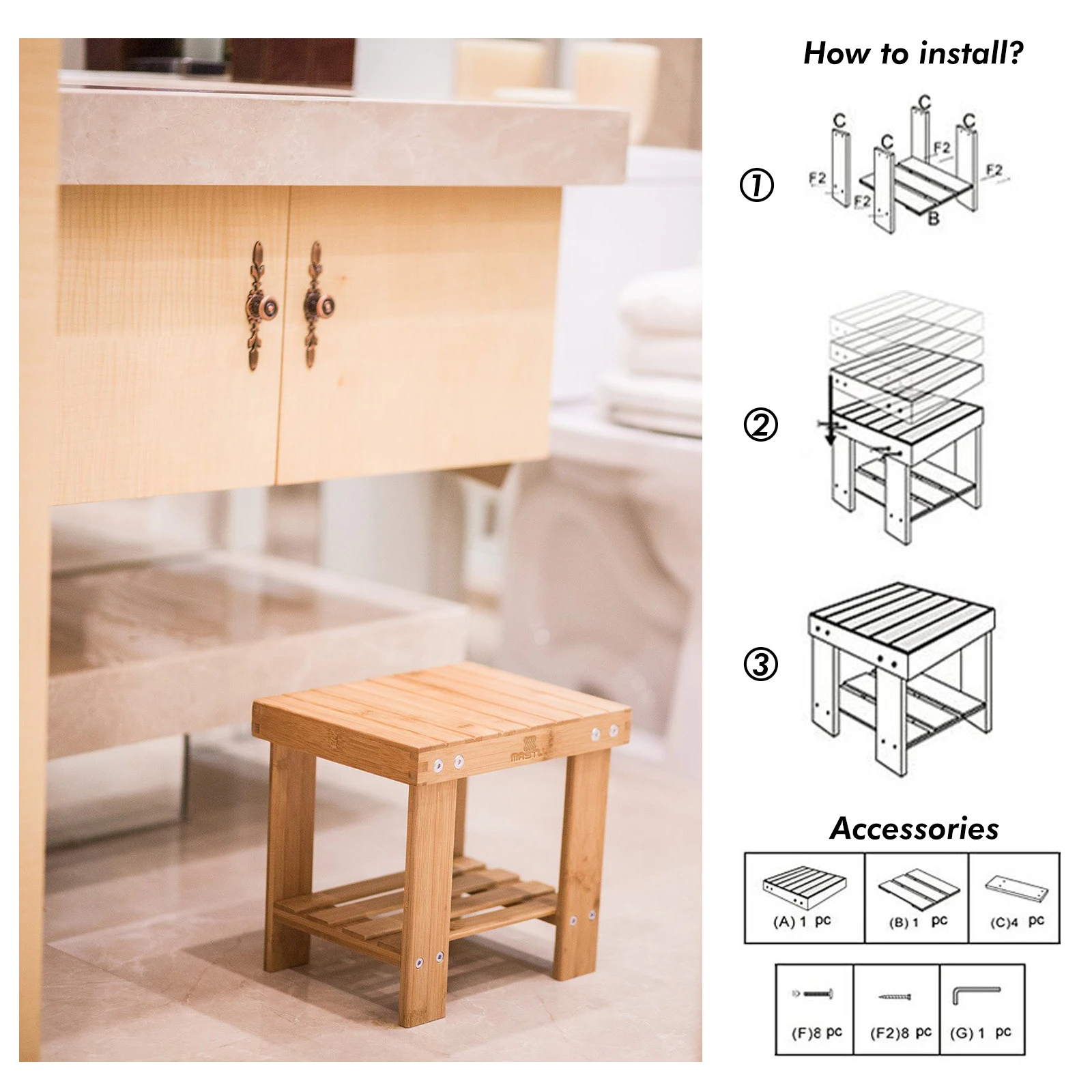 【Прочный и прочныйКаждая ножка стула имеет 3 сверхтолстые никелированные винты, чтобы сделать стул твердым. Используйте толстые высококачественные бамбуковые доски для лучшей защиты вашей семьи. Вторая полка может использоваться для хранения ваших тапочек или других предметов.