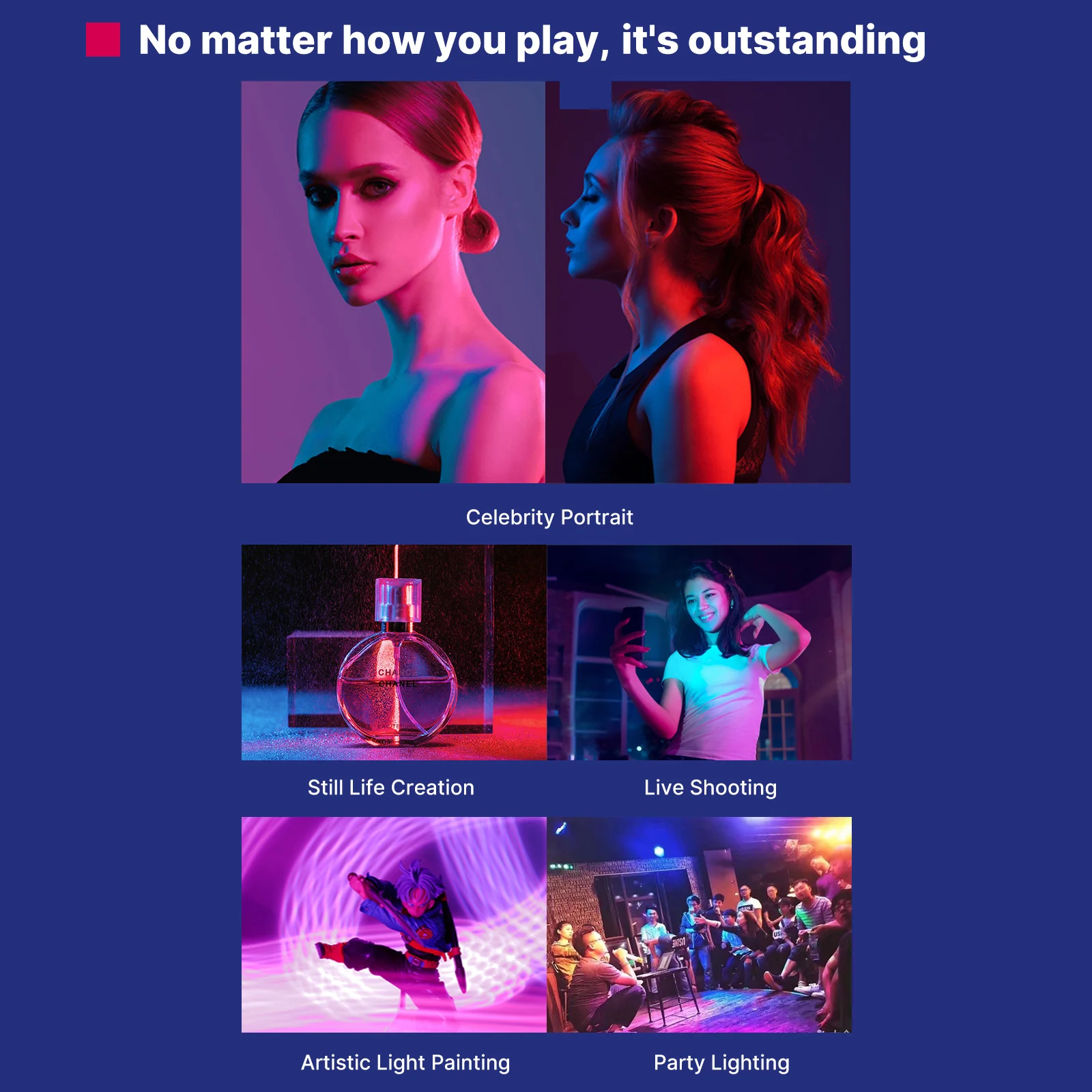 【Специальные эффекты освещения 】Поддерживает 20 специальных световых эффектов, включая скорой помощи, фейерверк, ТВ, свечи, вечерние, стробоскопы, RGB Стробоскоп, красную вспышку, зеленую вспышку, синюю вспышку, HSI slow, HSI fast и т. д. Предоставляет вам больше возможностей для различных приложений.