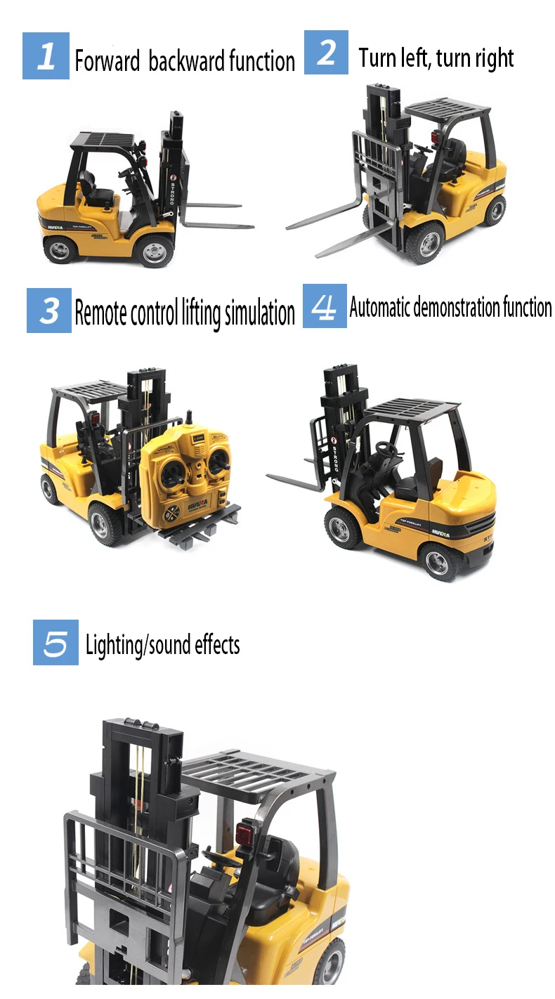 Описание функции:8-канальный дистанционный пульт инженерно-транспортное средство, сплав Материал, Рабочий стол (вилка для ног) дистанционный пульт моделирование подъема, дистанционный пульт вперед, назад, движение задним ходом, левый поворот, правый поворот, моделирование светильник и звуковой эффект; Автоматическая демонстрация функции который может нести бортовой грузовик для загрузки