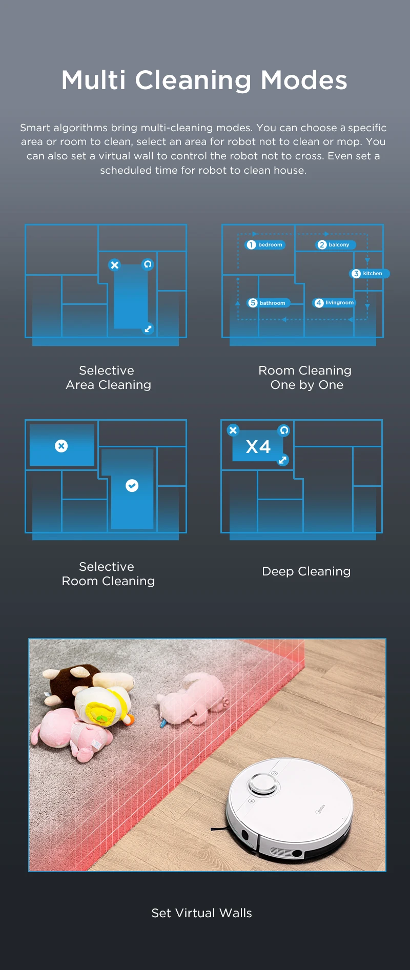 Вы можете выбрать определенную область или комнату для очистки, выбрать область для робота, чтобы не чистить или швабры.