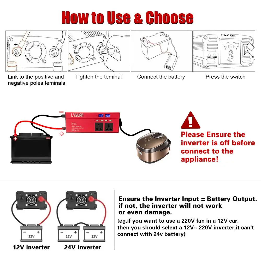 ③ Если вы хотите работать с индуктивной нагрузкой в течение длительного времени, рекомендуется купить инвертор чистой синусоидальной волны.