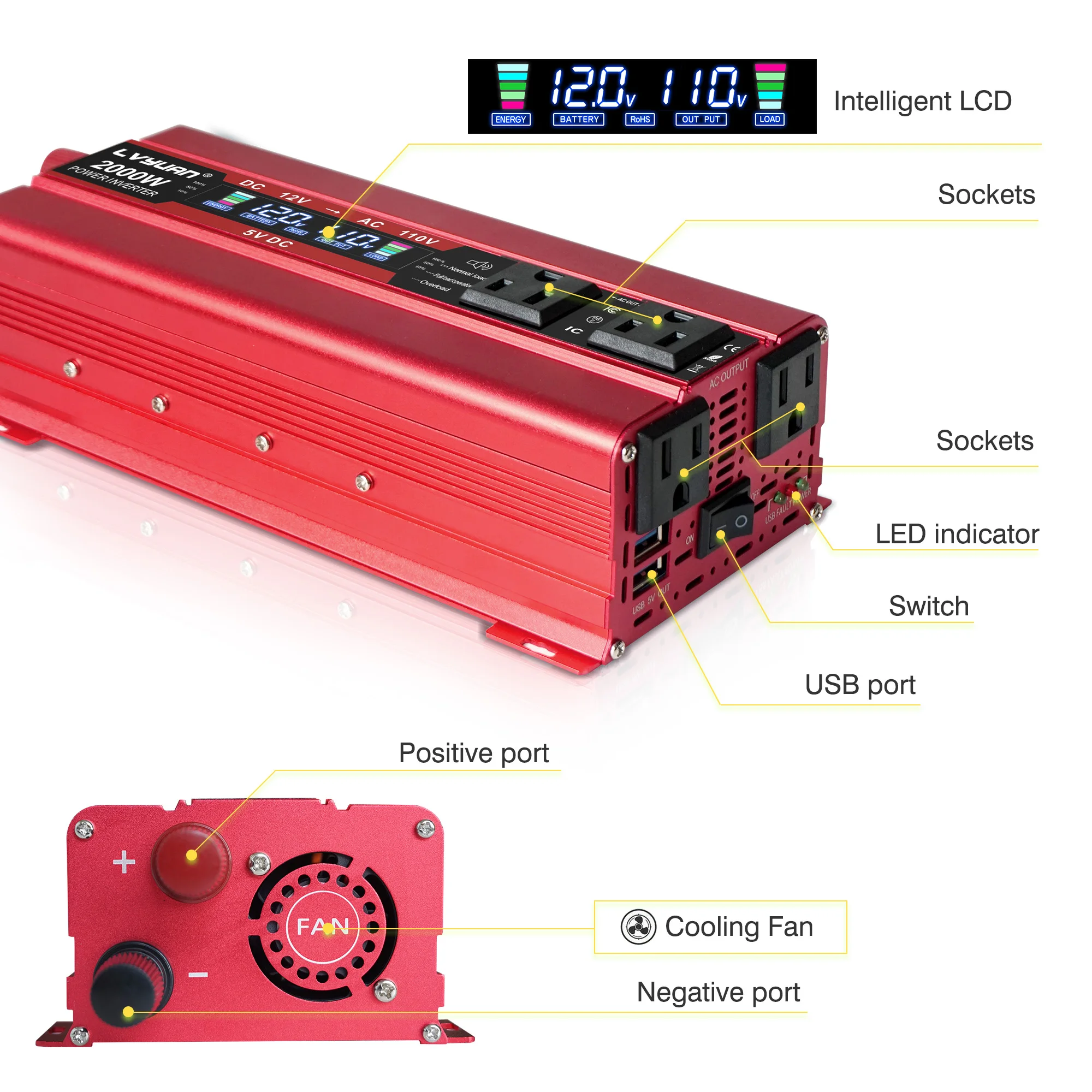 ЖК-дисплей показывает входное напряжение батареи, выходное напряжение. Кабель прикуривателя может легко поставить питание для устройства. Если выходная мощность выше, чем 150 Вт, пожалуйста, используйте зажимы типа «крокодил» для аккумулятора.