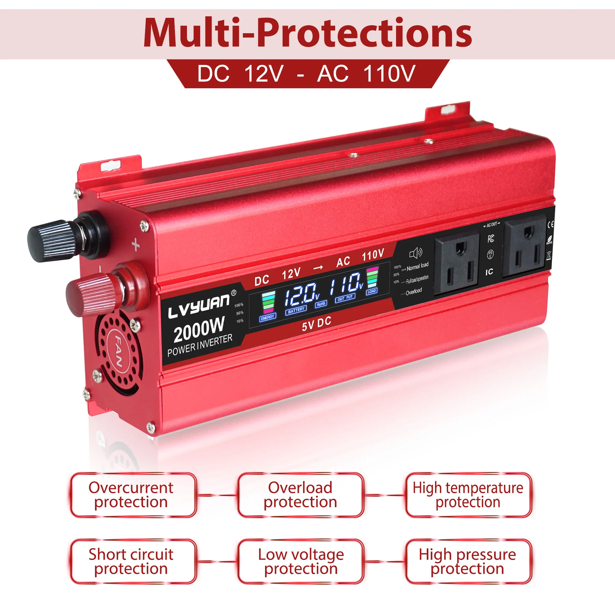 Встроенные предохранители, безопасная конструкция зарядки и охлаждающий вентилятор предотвращают перегрев автомобильного преобразователя питания, экономию энергии и энергии. Перенапряжения, перегрузки, перегрузки по току, короткого замыкания, низкого напряжения, перегрева, защиты от короткого замыкания.