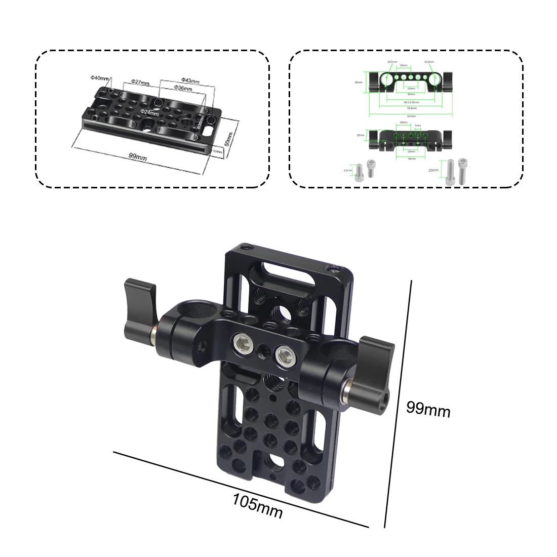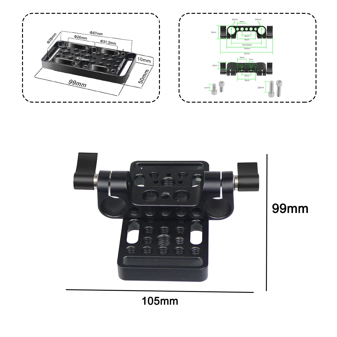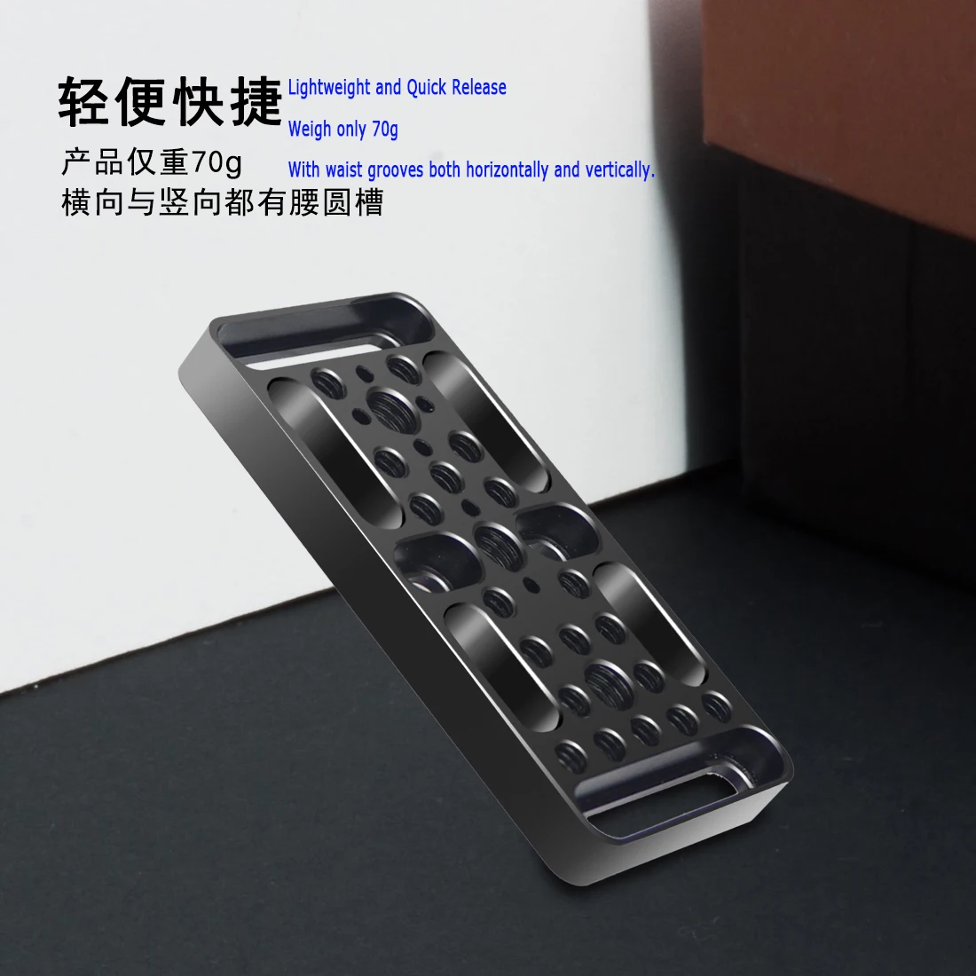 Особенности: легкий, универсальный с количеством резьбовых отверстий 1/4 и 3/8, дизайн с отверстиями для позиционирования ARRI и сидением для холодной обуви; Горизонтальный и вертикальный с круглой канавкой на талии; боковая пластина с отверстиями для расширения 1/4 дюйма; Может быть с другой быстроразъемной пластиной, составной L, может достигать горизонтальной и вертикальной съемки камеры