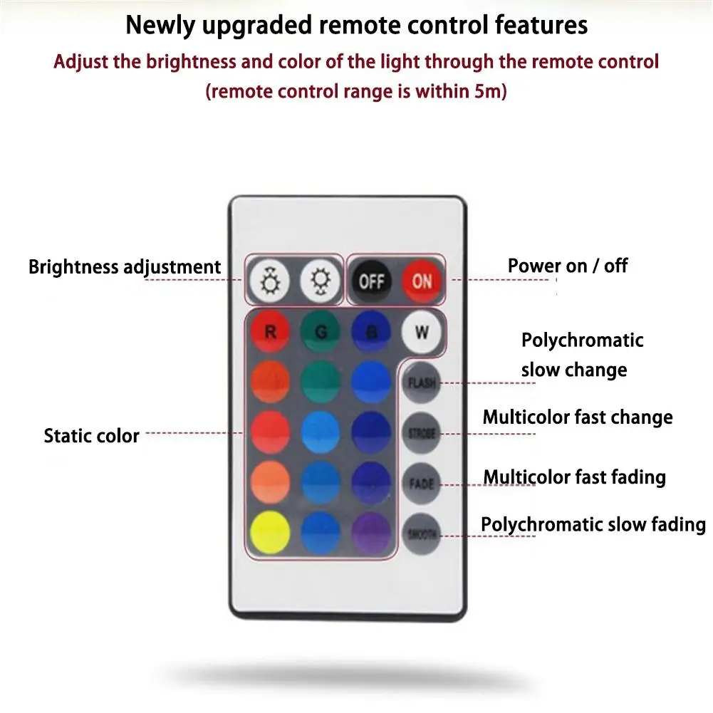 1. Модернизированный пульт дистанционного управления: многоцветное медленное изменение, многоцветное быстрое изменение, статический цвет и другие функции регулировки.