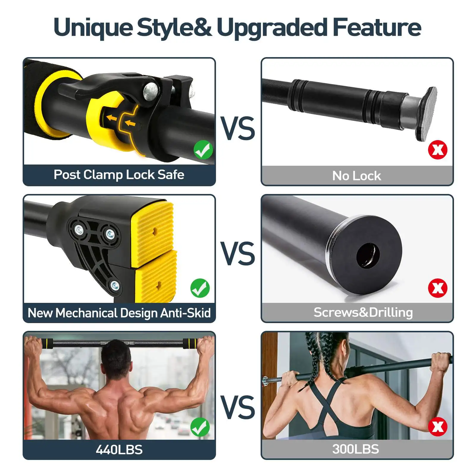 Сверхпрочный стальной материал и несколько винтов обеспечивают безопасность и стабильность, а также обеспечивают гибкость, чтобы легко перемещать тяговую планку на различные высоты.