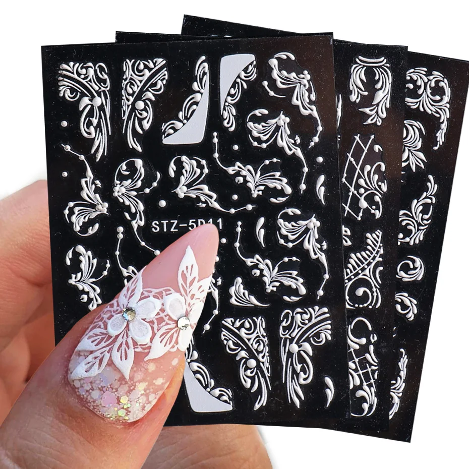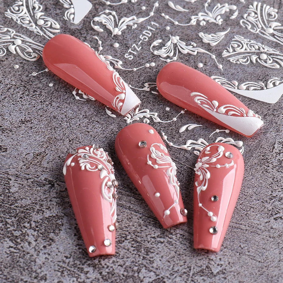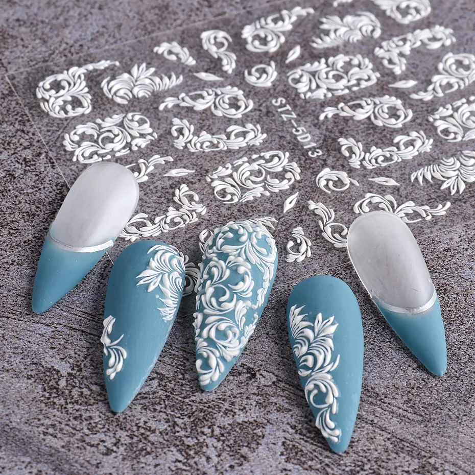 Отзывы о 5D тисненые наклейки для ногтей белые кружевные цветы ногтевого дизайна листья