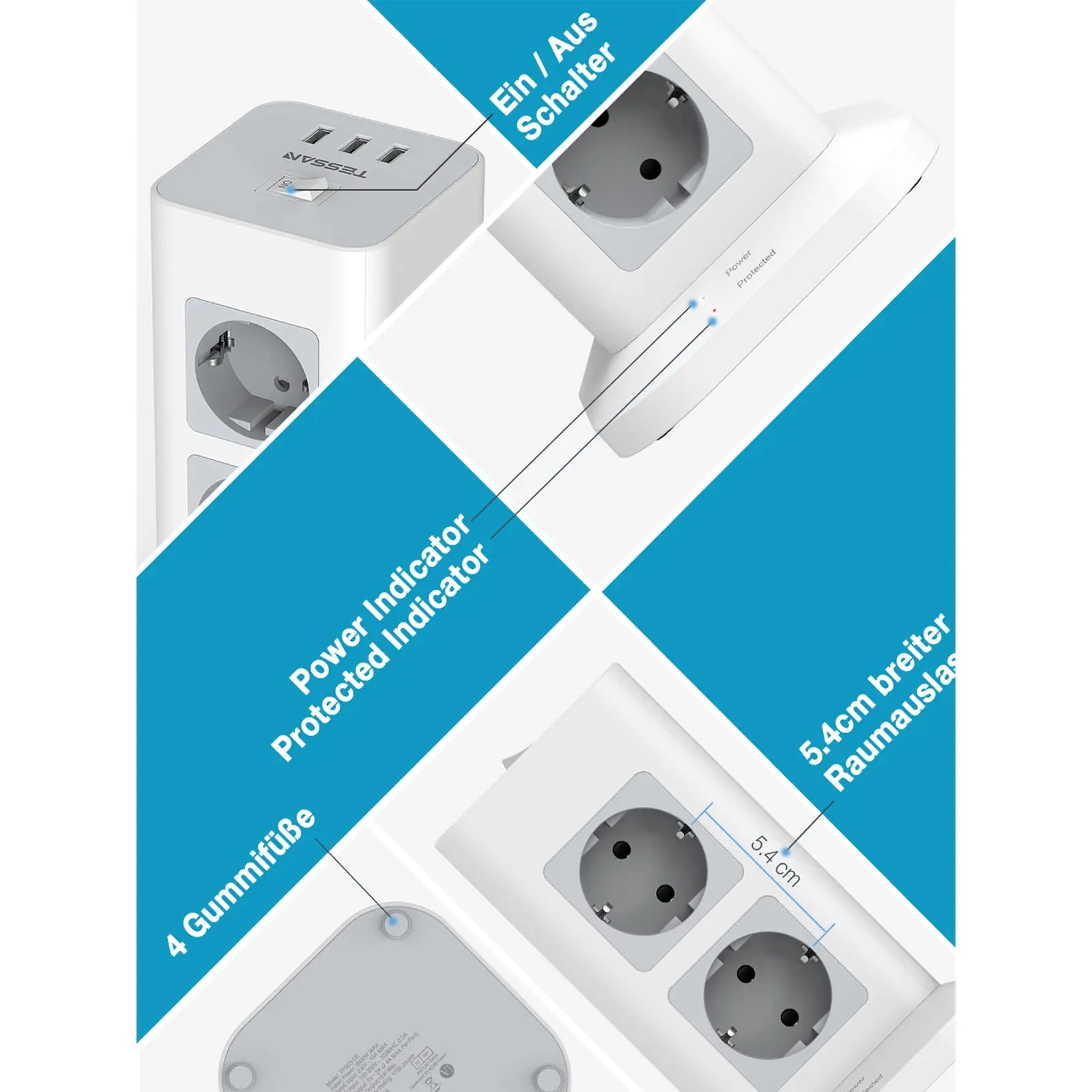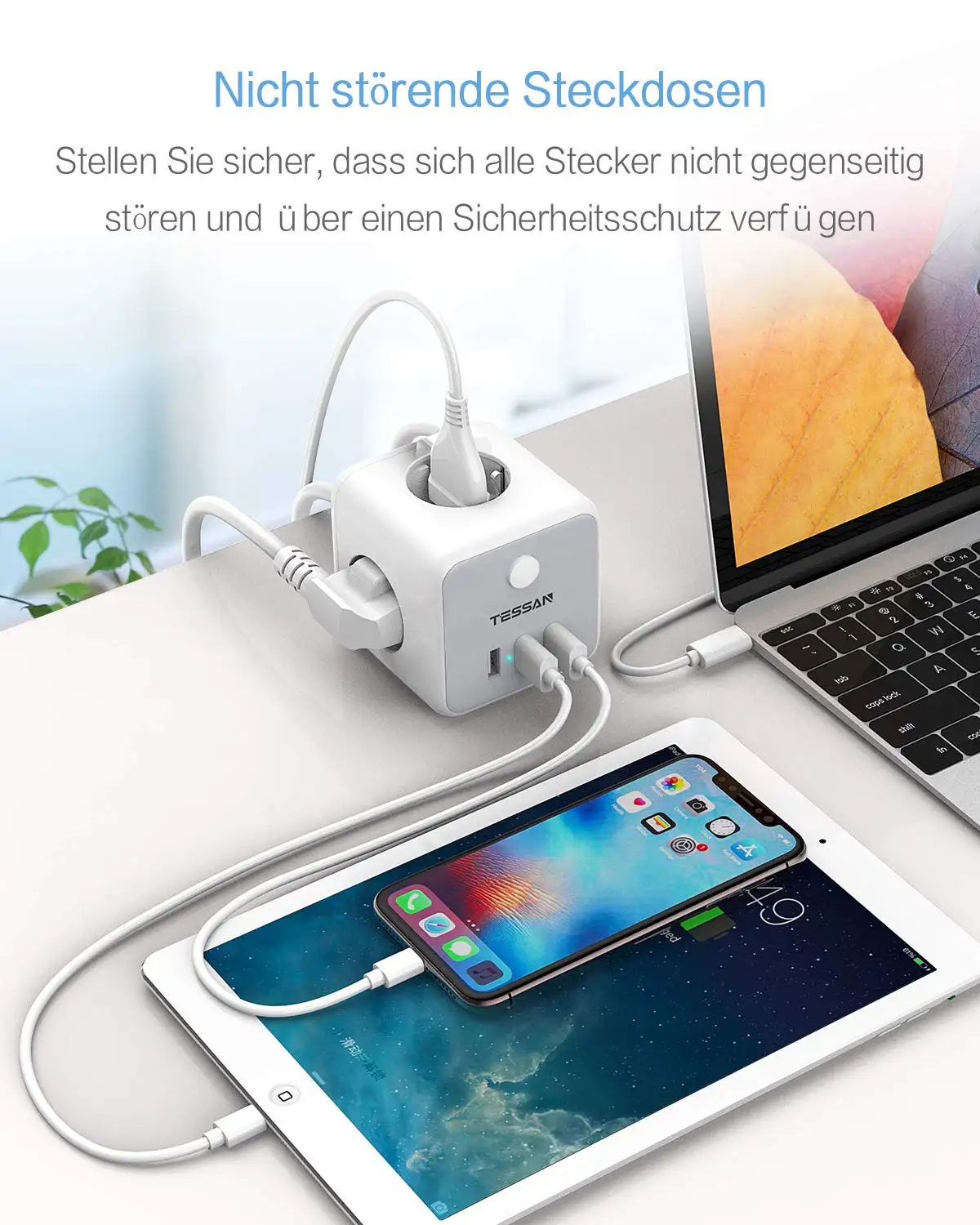 TESSAN несколько розеток С USB поддерживает общий ток 3A. Распределительная коробка с несколькими вилками может распознавать ваши устройства и передавать зарядный ток до 2,4 А, подходит для мобильных телефонов, планшетов и других usb-устройств.