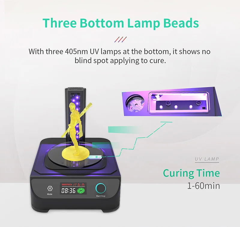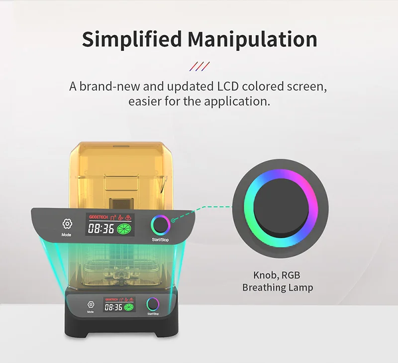 GCW02 является 2-в-1 стиральная и машина для отверждения для напечатанных моделей. Он оснащен мощным источником УФ-светильник, сенсорным управлением и индивидуальными ЖК-экранами. После обработки моделей, модели могут достичь наилучшего внешнего вида и производительности.