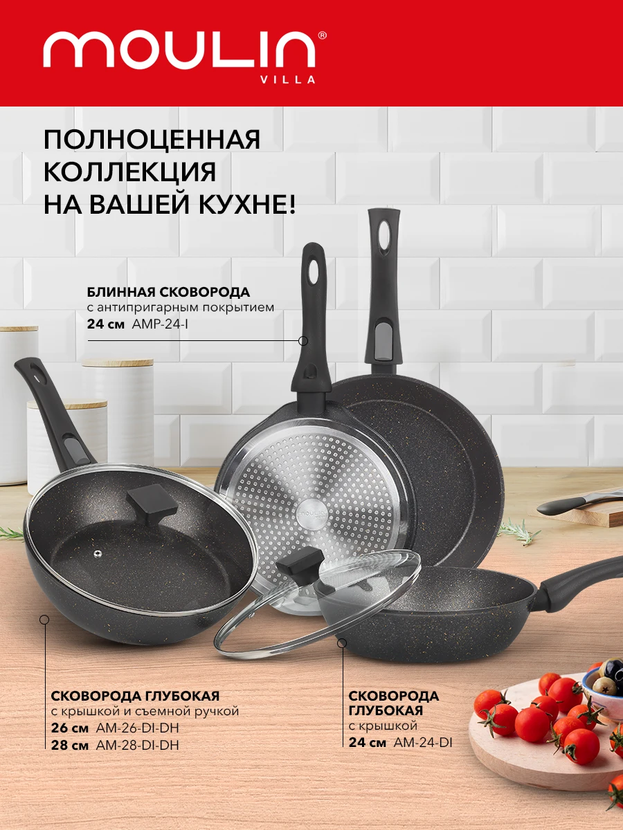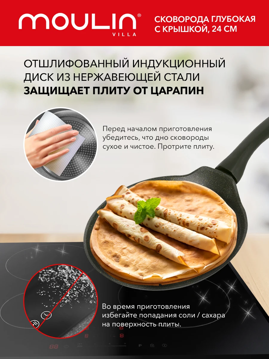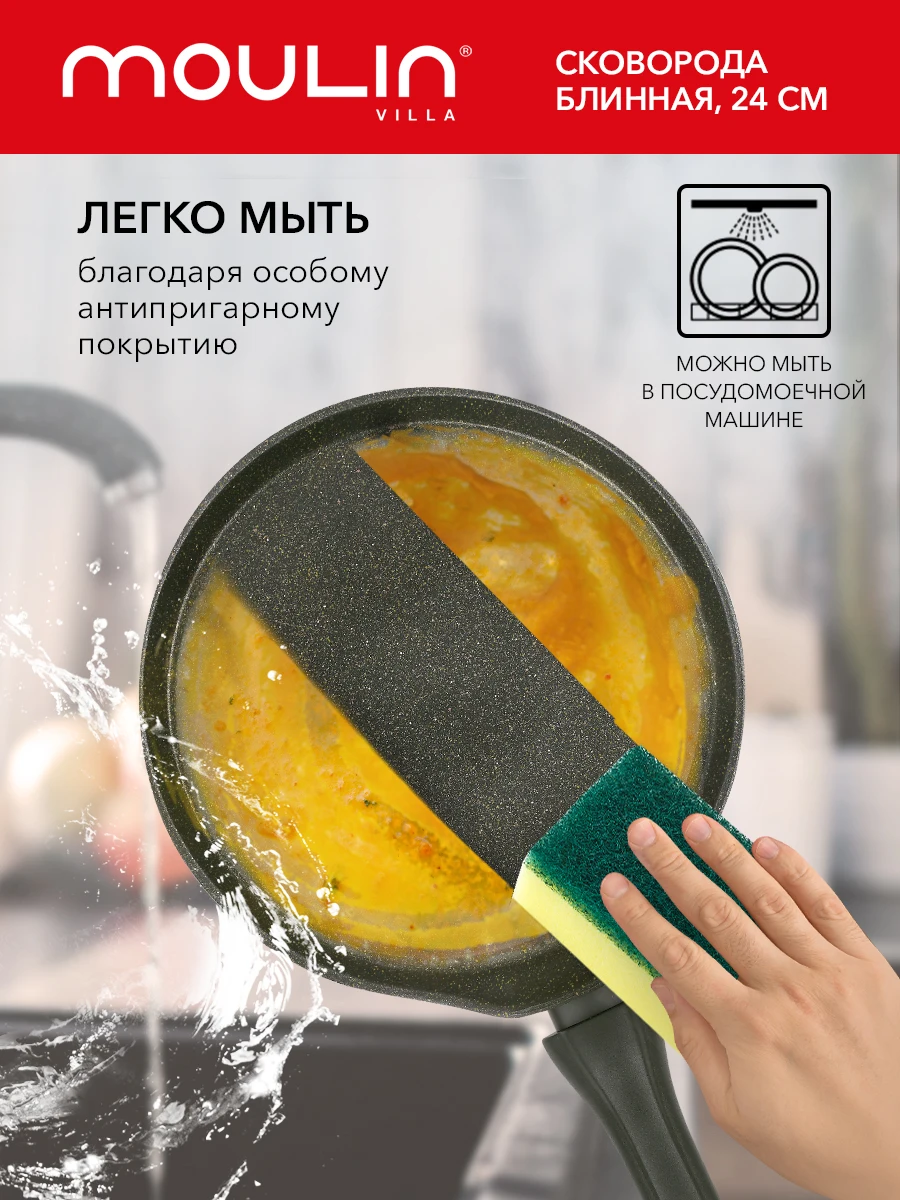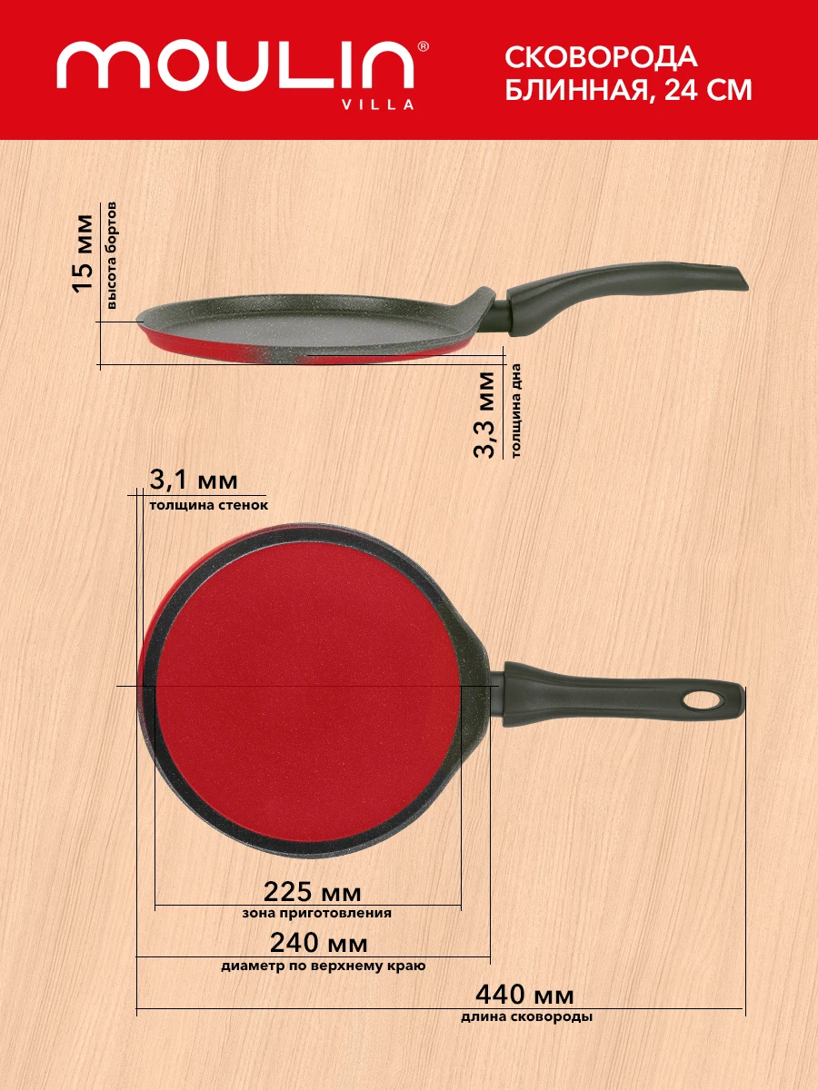 Cковорода блинная Amber 24 см пригодится для приготовления десертов и других вкусных блюд: ажурных блинчиков, оладий, сырников, пиццы на плите. Её также можно использовать для жарки мяса, яичницы, драников, бережного обжаривания овощей.