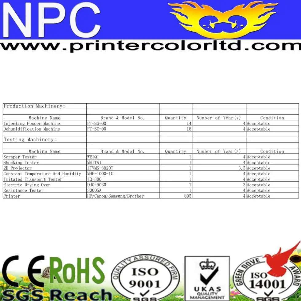 Статус | Совместимый новый и полный тонер-картридж | Процент дефектов | Менее 1% |