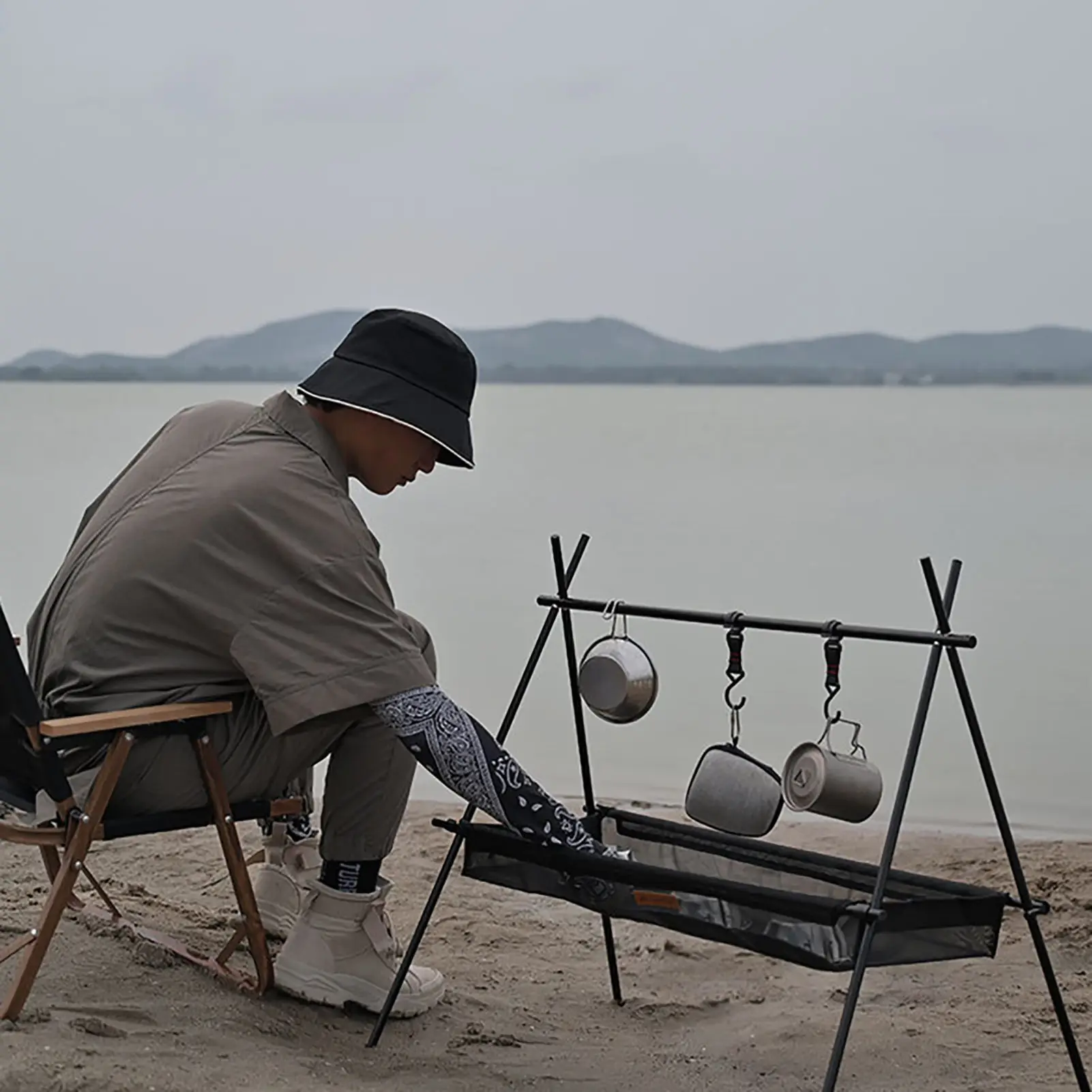 5. Использование: сетчатый мешок для хранения и стойка для хранения штатива можно использовать вместе с d. Он может положить больше посуды для кемпинга, что делает вашу столовую посуду более аккуратной и упорядоченной и удобной в установке и хранении.