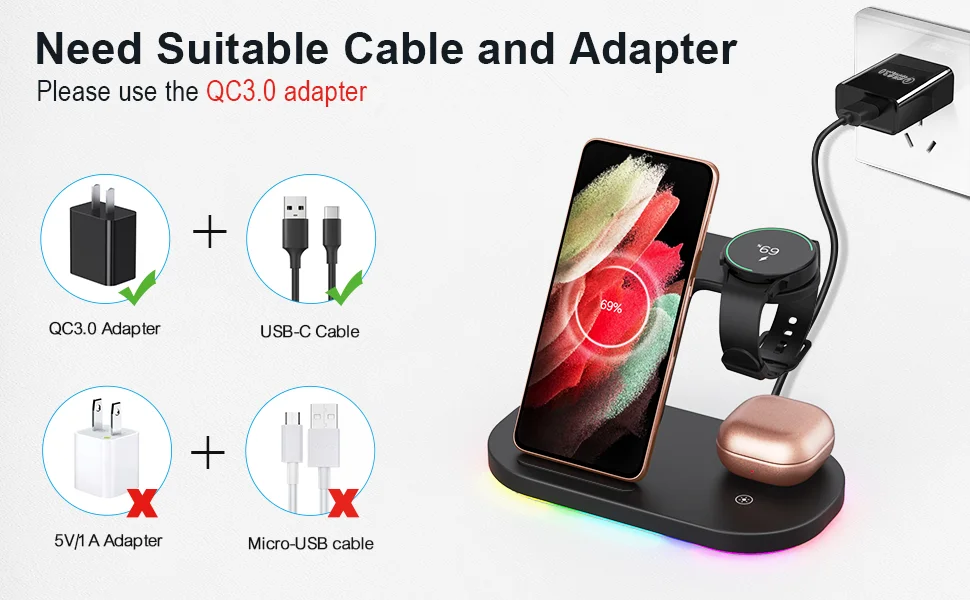 【 3 в 1 Беспроводное зарядное устройство, экономит пространство 】специально разработано для ваших устройств Samsung (телефон/часы/бутоны), отличная замена для беспроводного зарядного устройства Samsung, совместимо с Note 20/Note 10/Note 9, galaxy S22/S21/S20/S10/S9 , Galaxy Watch 4/Watch 4 Classic/Watch 3/Watch 3 LTE/Active 2/Active 2 LTE/Active 1, galaxy Buds/Buds +/Buds Pro/Buds Live/Buds 2.