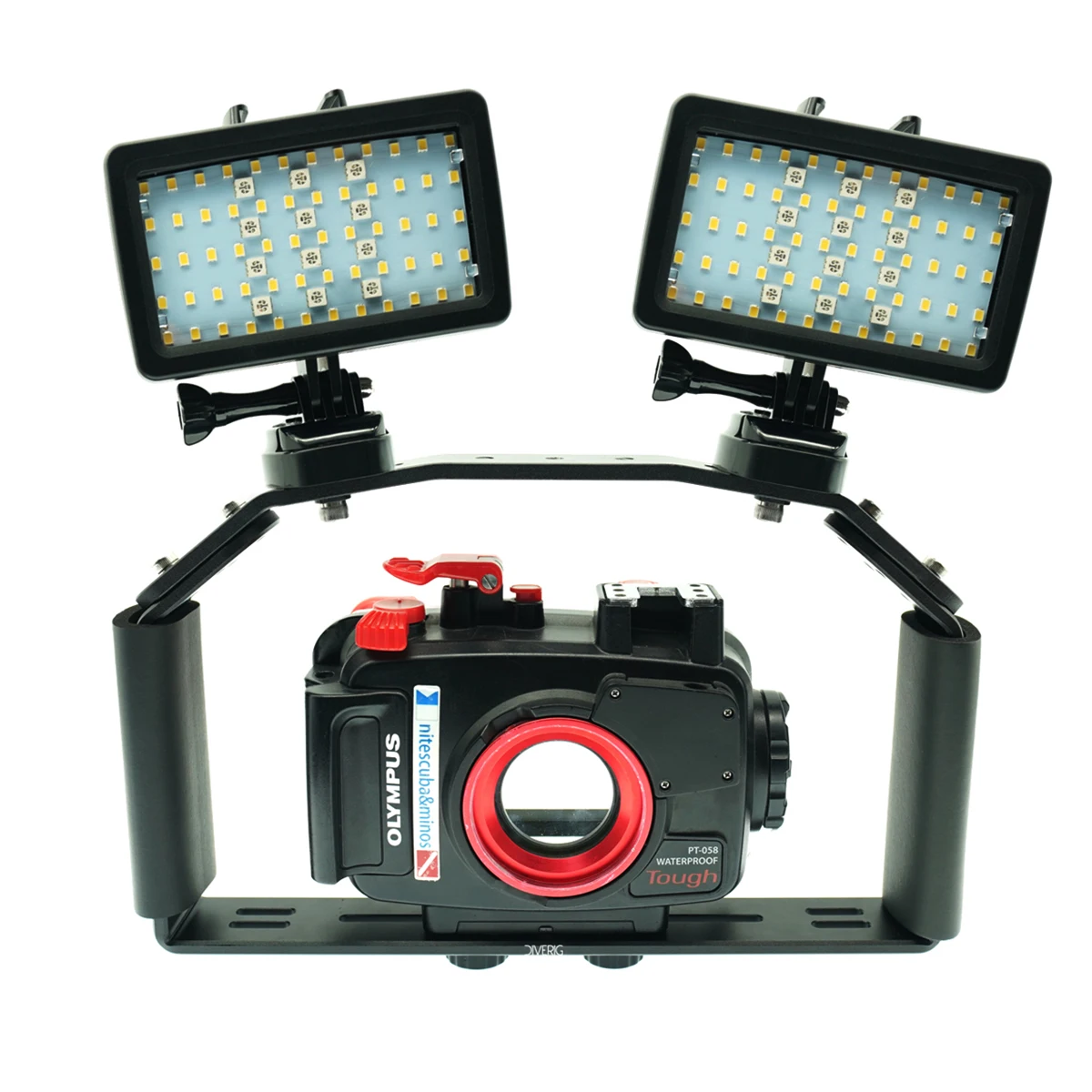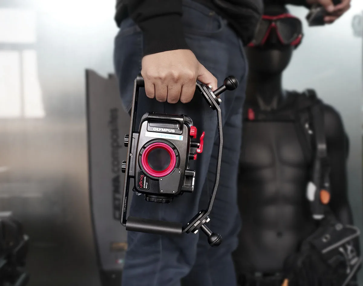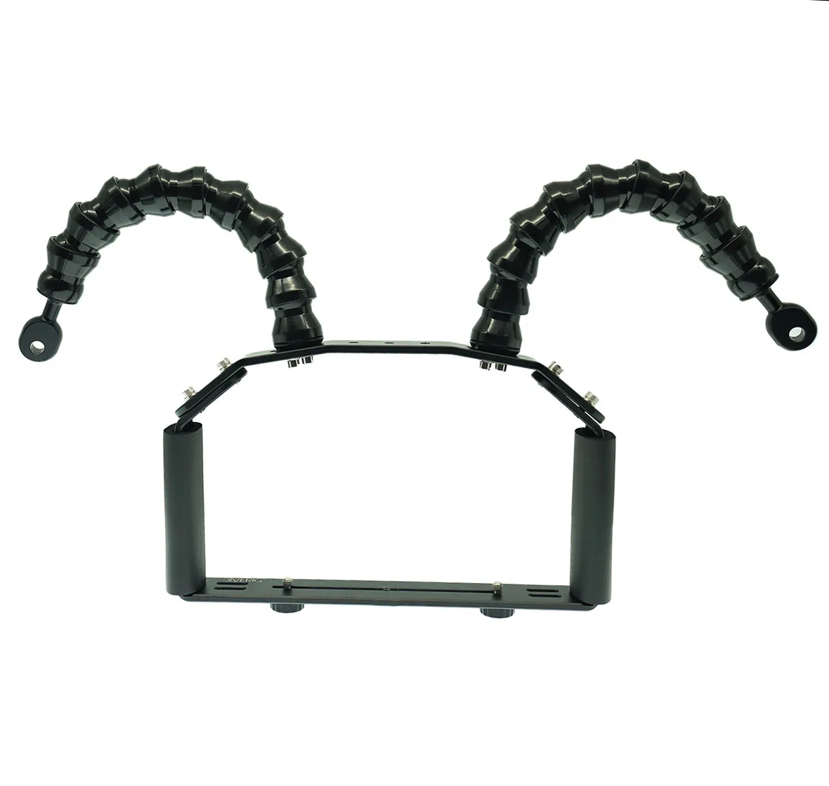②【Изготовлен из высококачественных материалов 】 1 комплект Двойной Ручной Стабилизатор, рамка из алюминиевого сплава премиум класса, двойная нескользящая резиновая крышка (съемная), с резьбовым отверстием 1/4 дюйма, один кронштейн для монтажа камеры (без камеры, без GoPro, без Дайвинг-светильник, без корпуса камеры)
