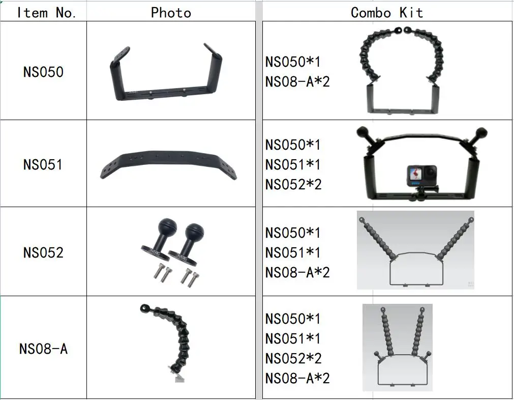 ④【Несколько монтажных портрет】с винтами 1/4 ", которые являются стандартными для большинства систем подводной фотографии/видеосъемки, для различных размеров камер, два 1" шарика позволяют прикрепить аксессуары, такие как руки, затем вы можете прикрепить дополнительные аксессуары, в том числе strobes и focus / video lights. Один действующий кронштейн для монтажа камеры для GoPro.