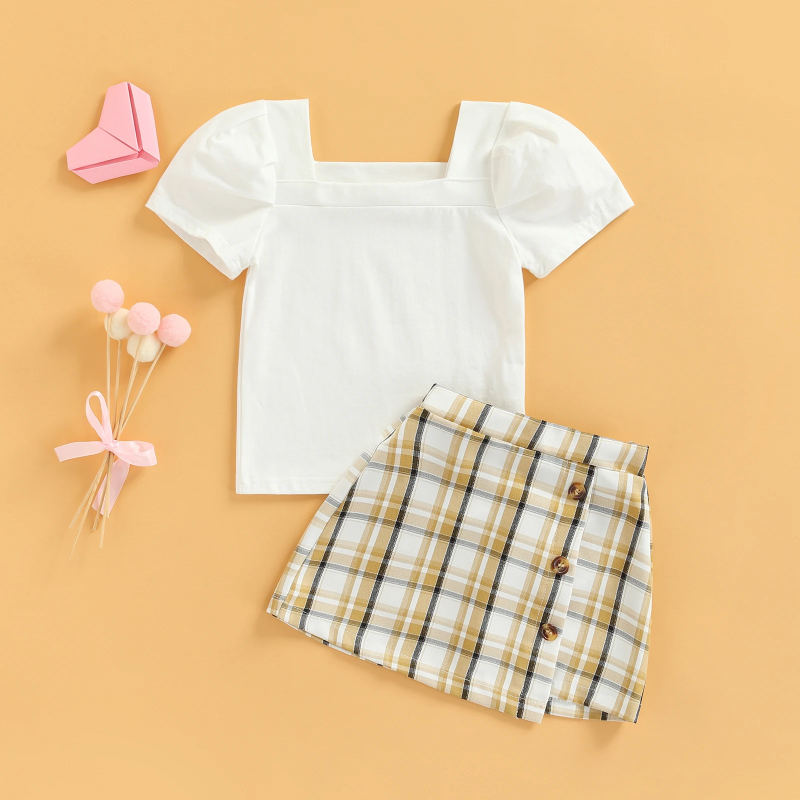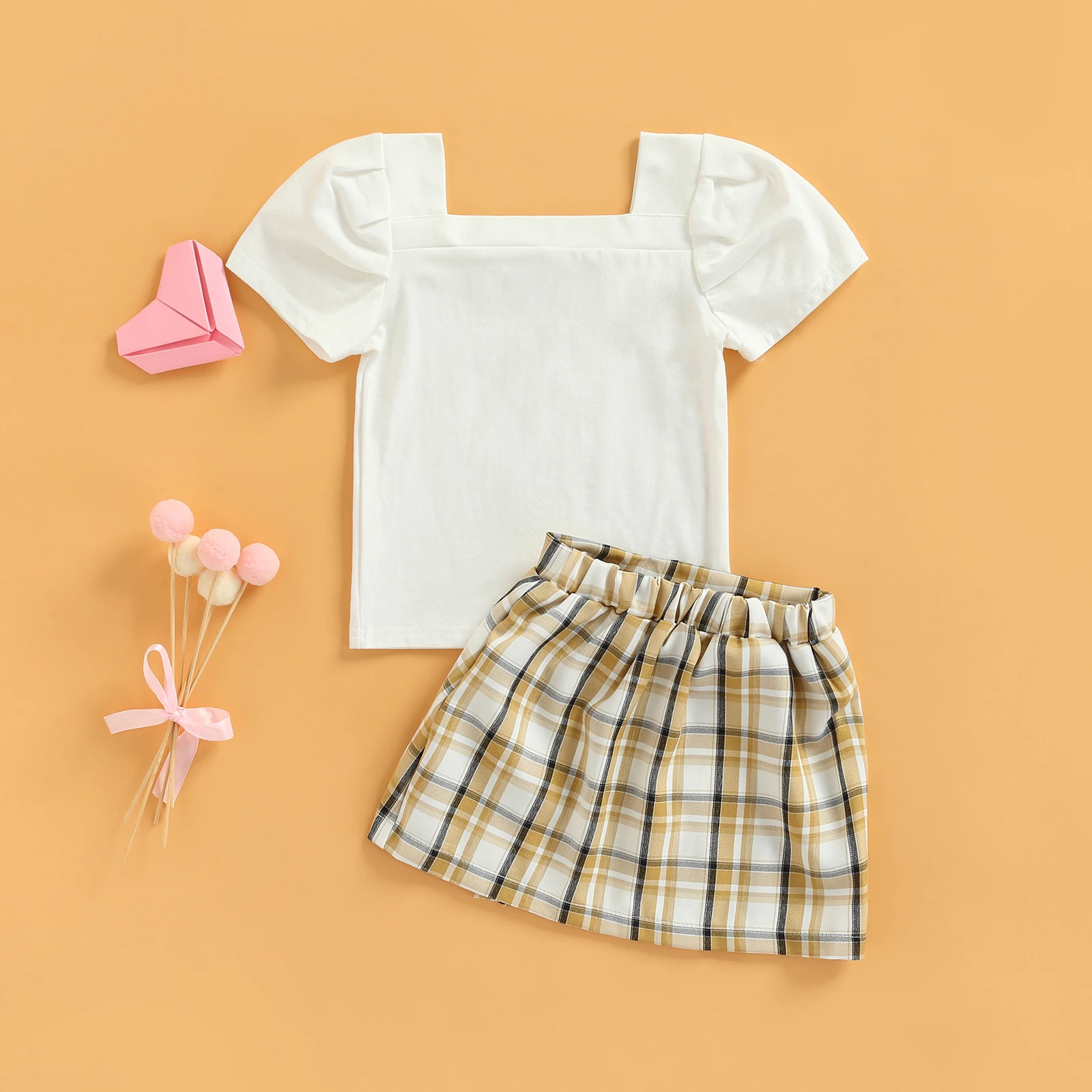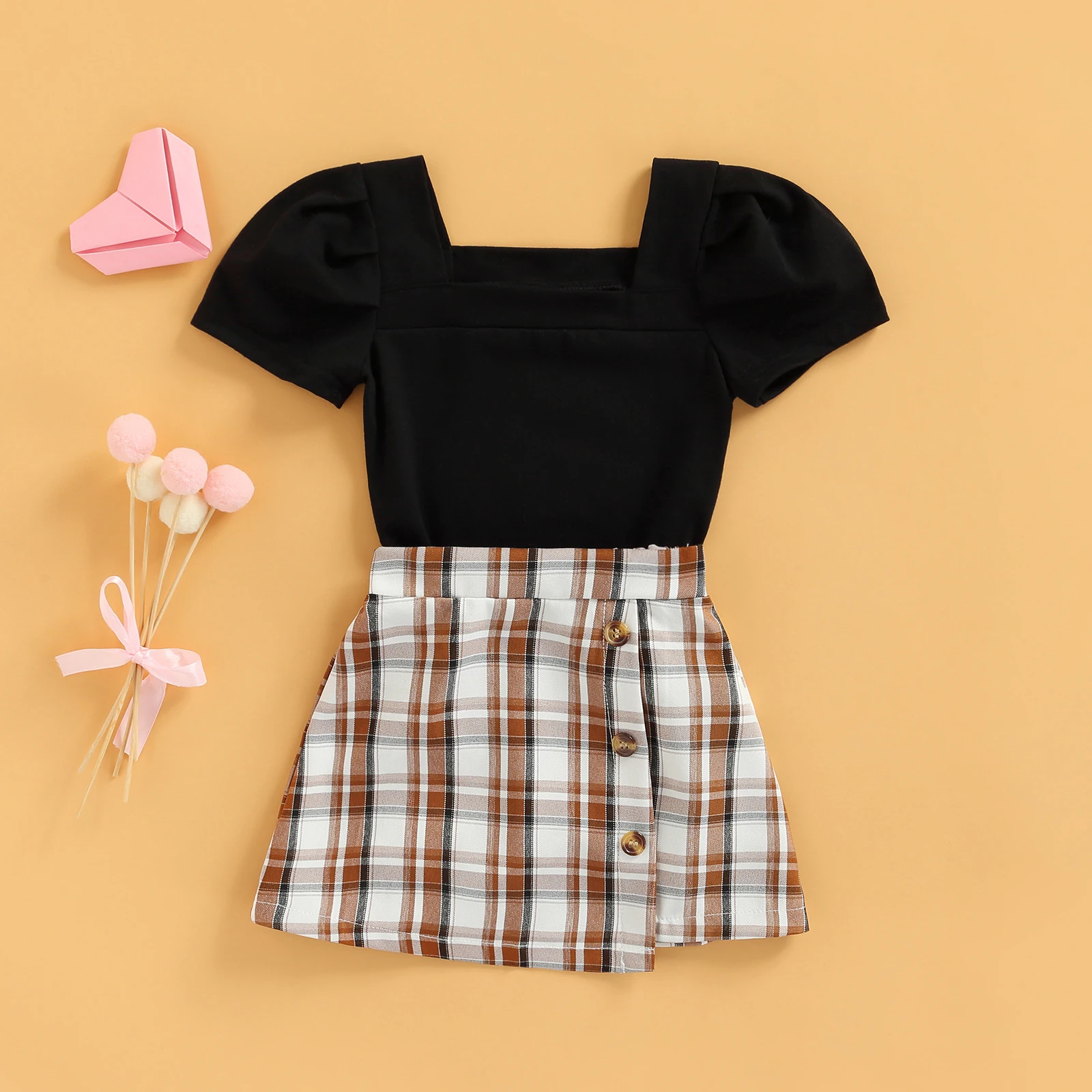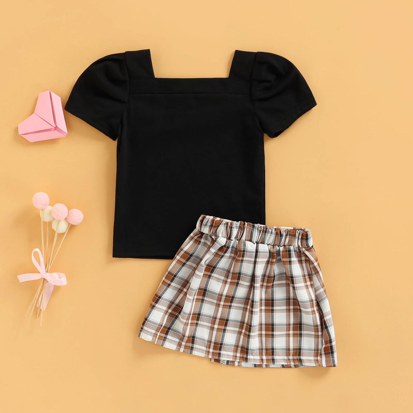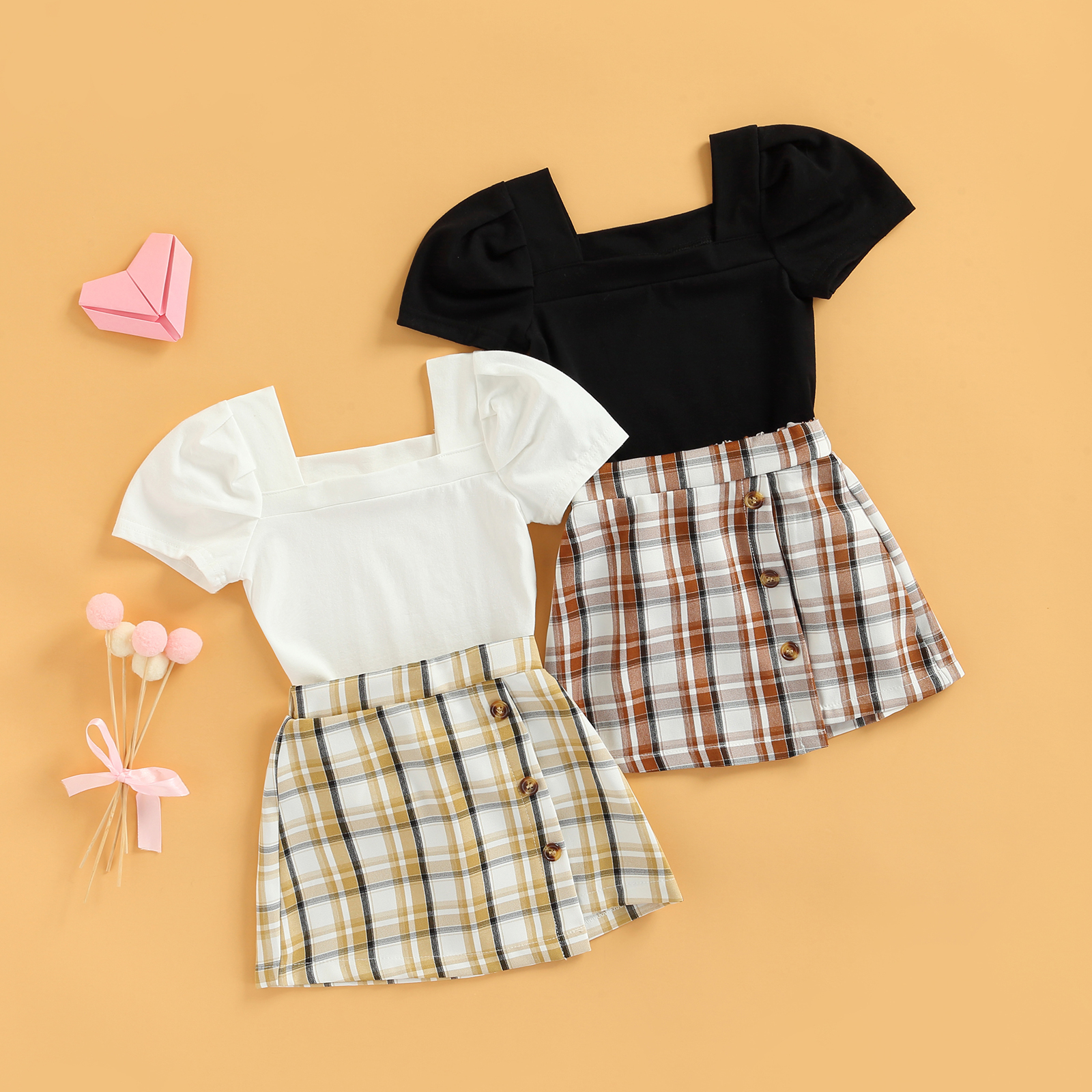 Детский костюм с короткой юбкой для девочек; Однотонные топы с короткими рукавами и квадратным вырезом; Юбка с узором в клеткуТаблица размеров: Размер (см) 90 Длина топа: 35 Бюст: 54 Длина юбки: 25 Возраст: 1-2 года 100 Длина топа: 38 Бюст: 57 Длина юбки: 27 возраст: От 2 до 3 лет 110 Длина топа: 41 Бюст: 60 Длина юбки: 29 возраст: От 3 до 4 лет 120 Длина топа: 44 Бюст: 63 Длина юбки: 31 возраст: От 4 до 5 лет 130 длина топа: 47 бюст: 66 Длина юбки: 33 возраст: От 5 до 6 лет