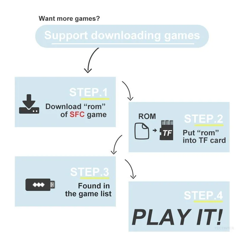 Встроенный 1500 игр, поддержка загрузки (только MD эмулятор). Классификация игры: Есть шесть категорий игр (приключения, борьба, головоломка, ресурсы, стрельба, спорт). Поддержка себя для загрузки игр.