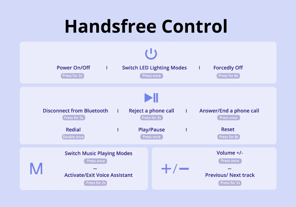 Нет, вы должны нажать кнопку M один раз, чтобы переключить режимы воспроизведения музыки с Bluetooth, Aux-in, tf-карты и USB флэш-накопителя в свою очередь.