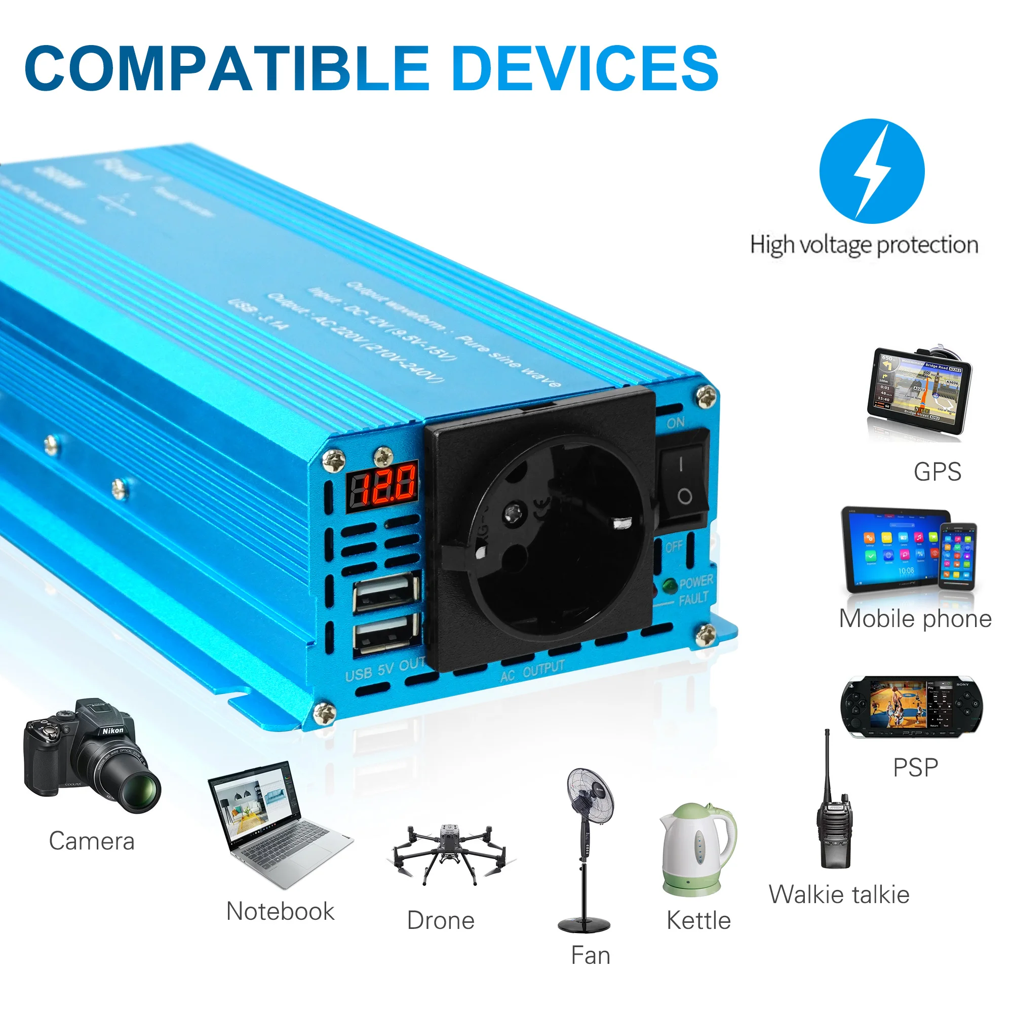 6. Пожалуйста, не перегружайте. Если ваши приложения индуктивные нагрузки, пожалуйста, выберите инверторы, непрерывная мощность которых в 3-7 раз выше, чем Ватты ваших приборов. Такие как холодильник, ледяной ящик, дрель, стиральная машина, водяной насос, микроволновая печь, духовка, пылесос, фен и т. д. с двигателем внутри. Пожалуйста, убедитесь, что постоянная мощность нашего инвертора отвечает вашим потребностям перед заказом, или проконсультируйтесь с нами для получения более подробной информации.