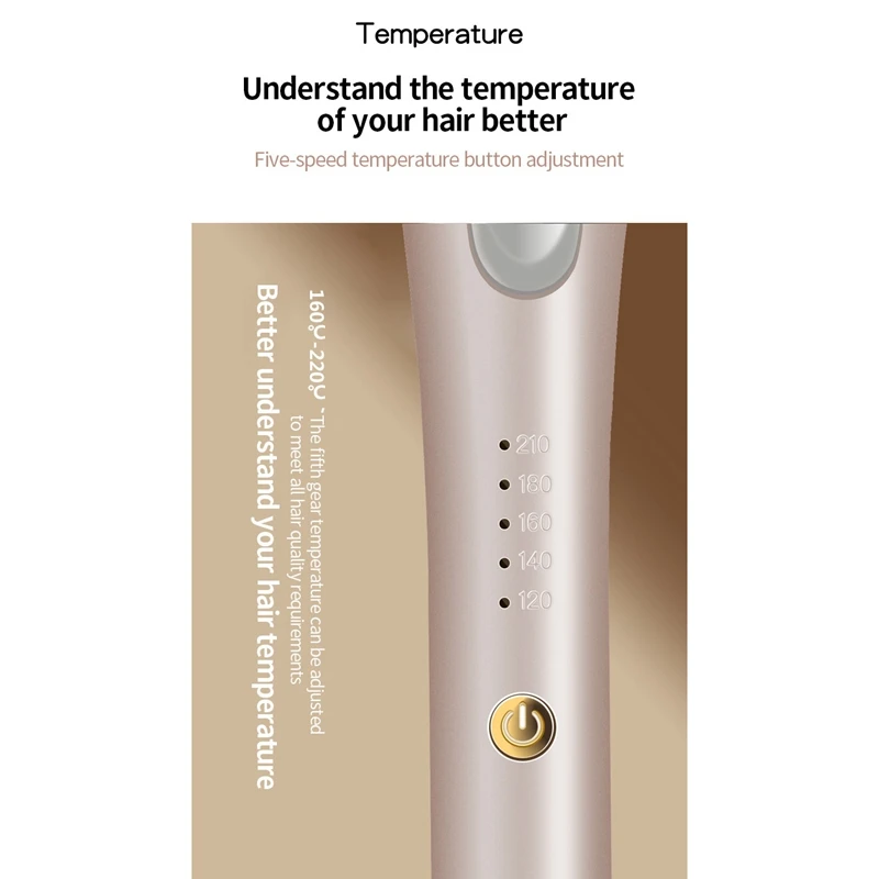 5 регулируемых температур: 120 °C(248 °F),140 °C(284 °F), 160 °C(320 °F), 180 °C(356 °F), 210 °C(410 °F), подходит для всех типов волос.