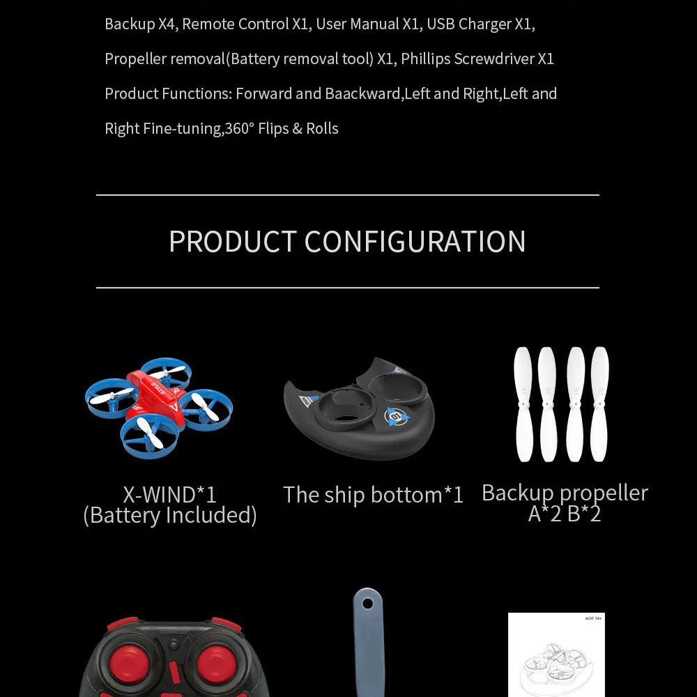 1: продукт имеет функции вперед и назад, левого полета, правого полета, левого вращения, правого вращения, аварийной остановки, 360 ° рулона и т. Д.