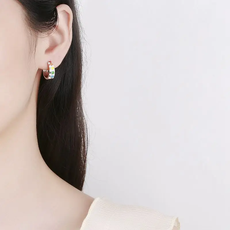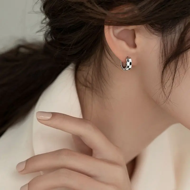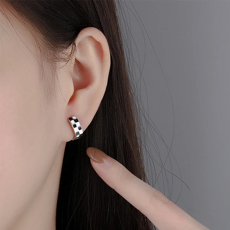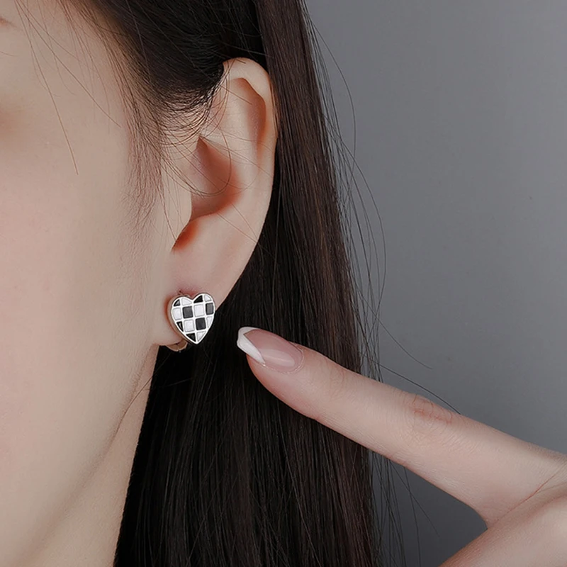 Серьги-кольца из стерлингового серебра 925 пробы с мозаичной геометрией черно-белые серьги в виде сердца в шахматном стиле Женская Модная бижутерияПохожие товары