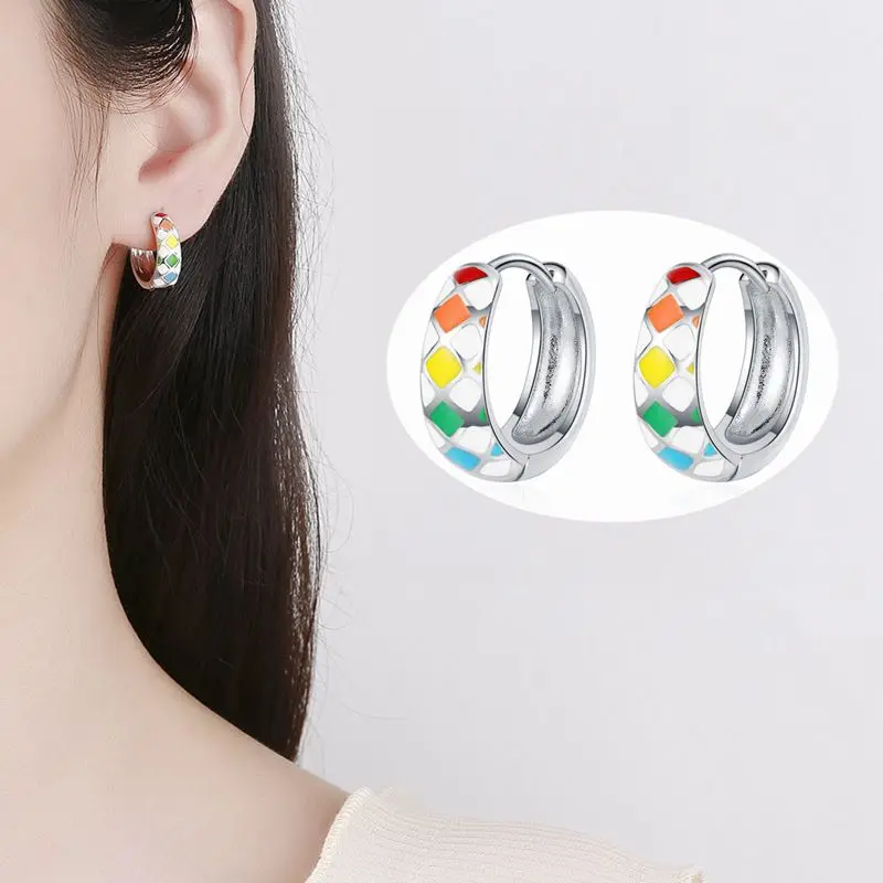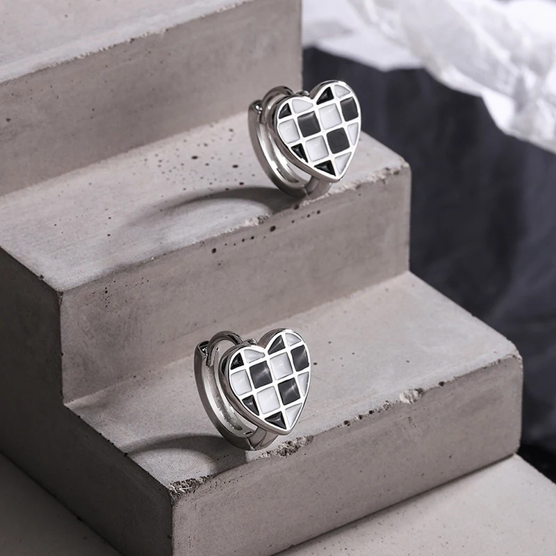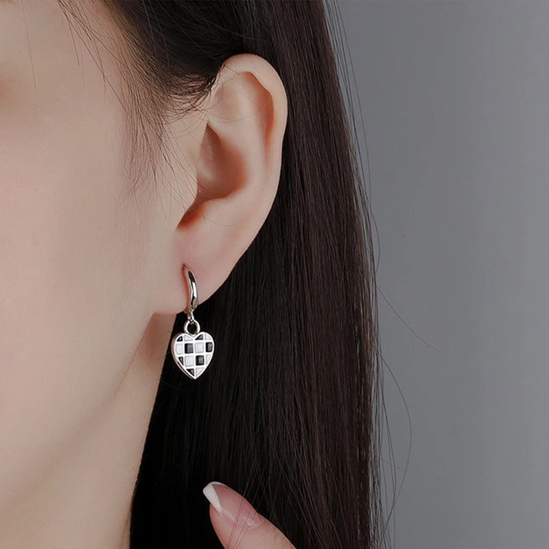 Серьги-кольца из стерлингового серебра 925 пробы с мозаичной геометрией черно-белые серьги в виде сердца в шахматном стиле Женская Модная бижутерия