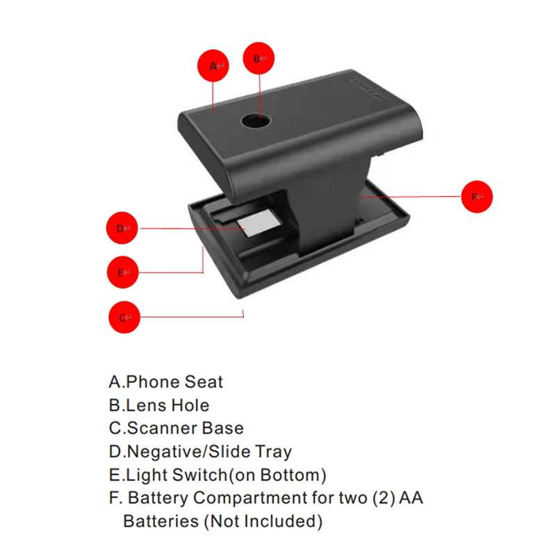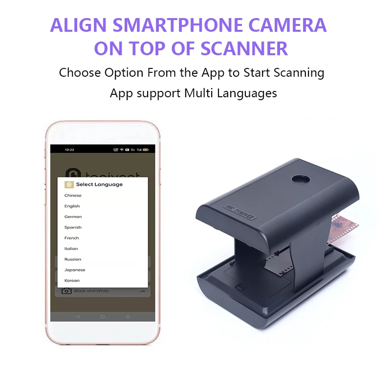 Простой в использовании-вставьте слайд или отрицательный элемент в лоток, включите Встроенный светодиодный фонарь, поместите объектив вашего смартфона через отверстие, а затем нажмите, чтобы запечатлеть. Обратите внимание: Качество фотографий будет ограничено разрешением камеры вашего телефона.