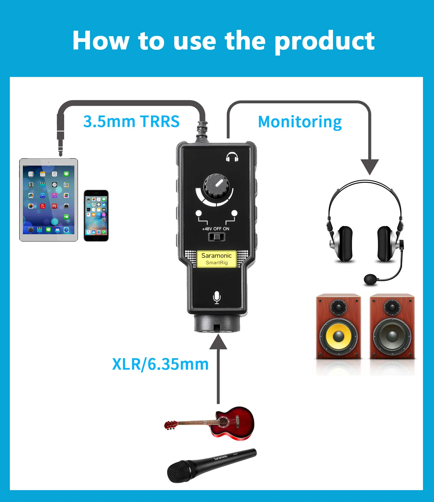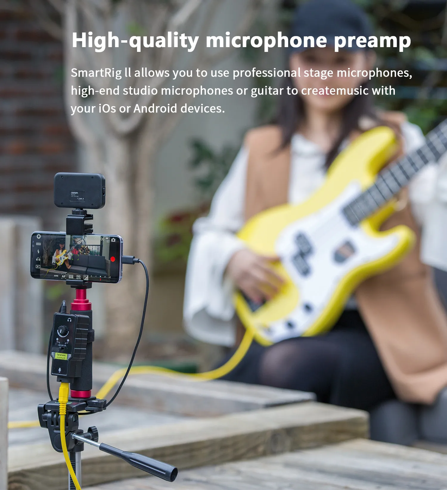 Saramonic SmartRig II-это простое решение для подключения к любой xlr-микрофон или 6,3 мм Гитара для вашего iPhone, iPod touch, или iPad и устройств на базе Android. Как высококачественный микрофонный предусилитель, Saramonic SmartRig II позволяет использовать профессиональные сценические микрофоны или высококлассные студийные микрофоны для создания музыки с мобильных устройств iOS или Android.